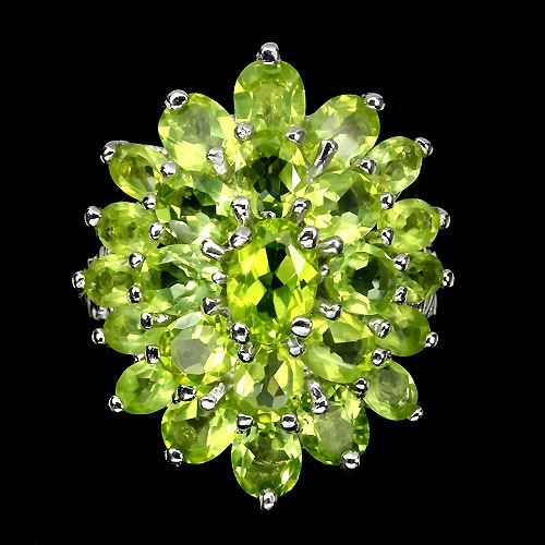 PERIDOT (NATURAL) 14K WHITE GOLD COATING 925 SILVER RING;UNIT OF ITEM (S):1 PIECEWEIGHT (CT.):38.63 CT. (total weight of silver + stone)DIMENSION:* STONE 4.0 X 3.0 TO 7.0 X 5.0 MM. * RING SIZE 8.0 * FACE RING 27.0 X 22.0 MM.SHAPE/CUT:OVAL FACETCOLOR:TOP RICH GREENCLARITY/GRADE:IF TO VVSLUSTER:ELEGANTTREATMENT:UNHEATEDORIGIN:PAKISTANHARDNESS:6.5 - 7.0