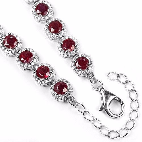 GENUINE BLOOD RED RUBY WHITE CZ 925 SILVER BRACELET 14K WHITE GOLD COATING;LENGTH OF ITEM (Inch.) 9.00 ; ITEM QUANTITY -1; STONE SHAPE -ROUND FACET CUT; STONE DIMENSION -4 MM.; ITEM WEIGHT -12.7 GRAM COLOR -Pigeon BLOOD RED; LUSTER -ELEGANT; TREATMENT -HEATED; ORIGIN OF STONE- AFRICA HARDNESS -9.0; WHITE CUBIC ZIRCONIA- 1 MM.;