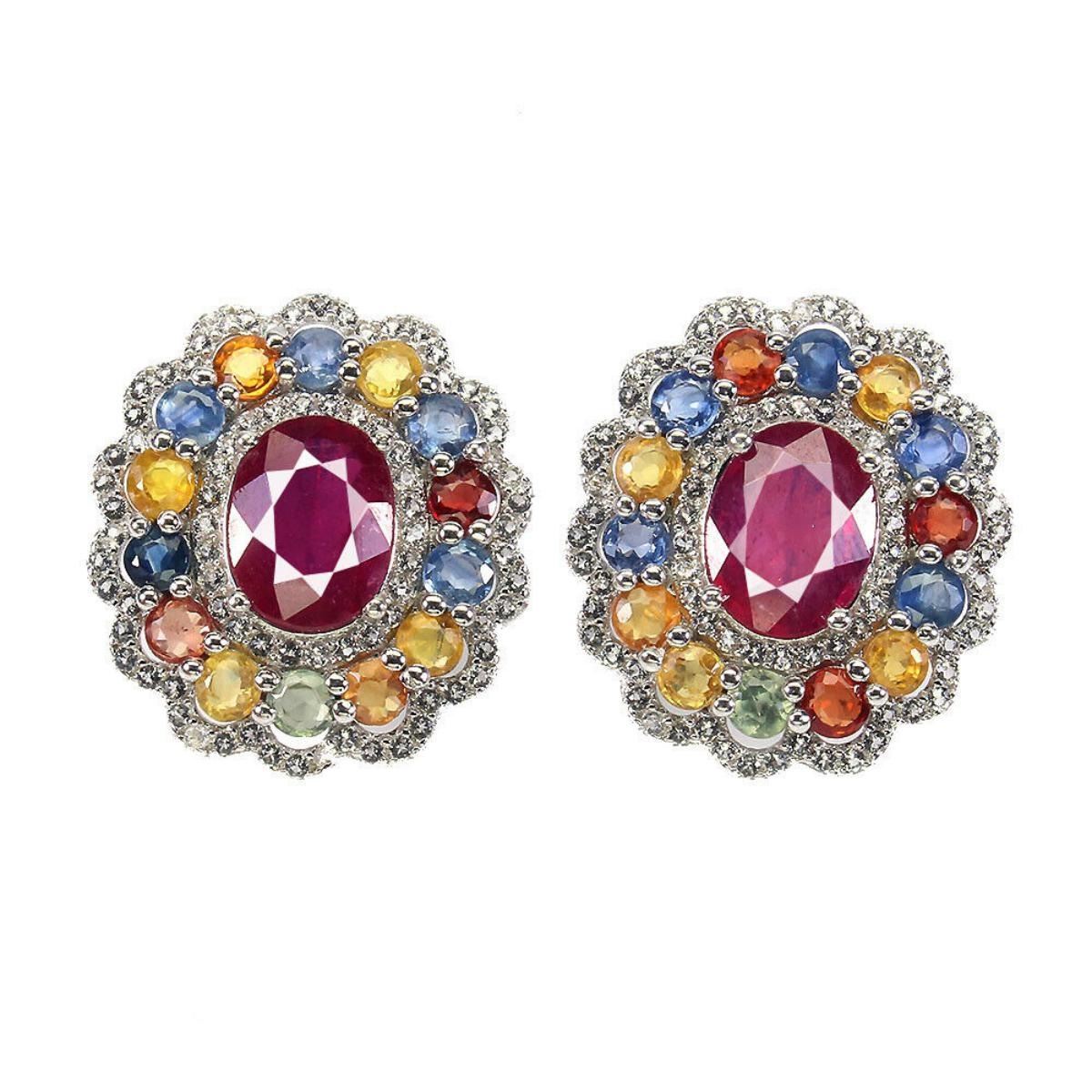 925 STERLING SILVER;PLATE-14K WHITE GOLD;MAIN STONE-RUBY;OTHER GEMS-SAPPHIRE, WHITE TOPAZ;TOTAL WEIGHT-6.86 GRAM (TOTAL WEIGHT OF SILVER + STONE)DIMENSION-* STONE 1.0 TO 9.0 X 7.0 MM.;* FACE EARRINGS- 20.0 X 18.0 MM.;MAIN STONE SHAPE-OVAL CUT;MAIN STONE COLOR-BLOOD RED;TREATMENT-Yes;ORIGIN-MADAGASCAR;HARDNESS-9.0;