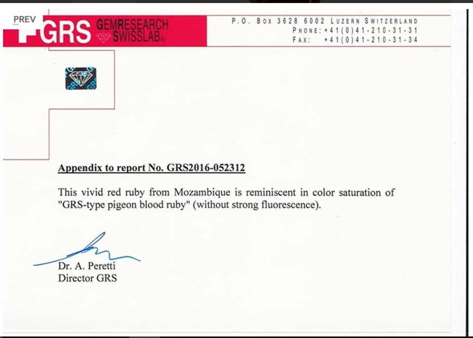 Natural Pigeon Blood Ruby 4.5 Carats - GRS Certified......Shape -Oval.......SI1.....completely Eye clean......Measurements:9.84 x 7.94 x 6.53 mm; Intense Pigeon Blood Color.....not heated or treated in any way....Origin: Niassa Mines (Mozambique); Hardness 9;