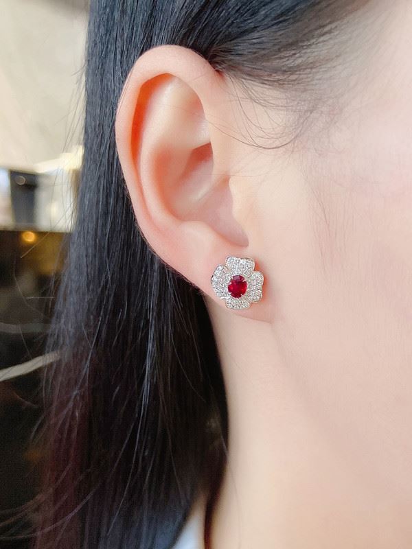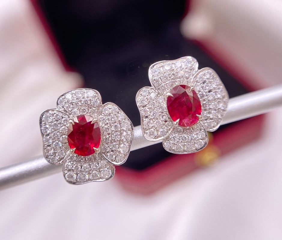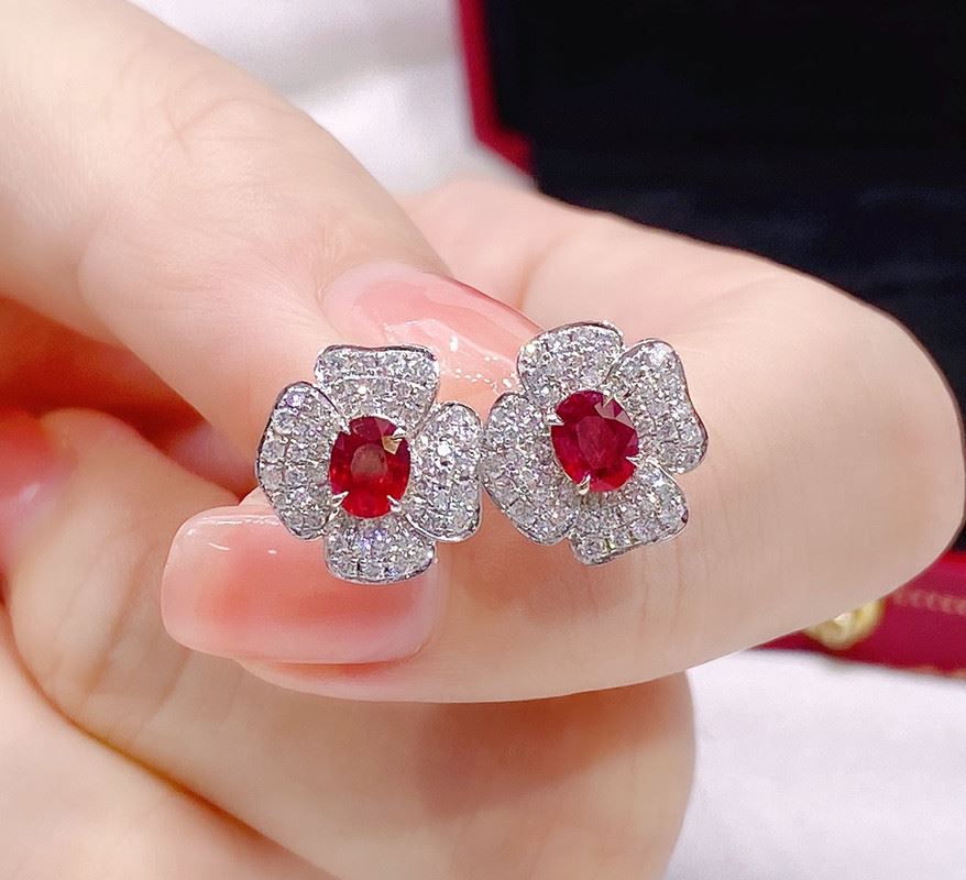 Natural pigeon blood rubies glow with fiery brilliance at the center of diamond-paved petals. The floral design balances radiance and grace, embodying noble elegance and timeless romance. Main diamond: 0.768ct, side diamonds: 0.527 ct. Note: Comes with an AGL certificate and a domestic jewelry identification certificate.