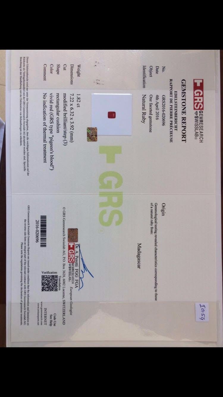 Natural Pigeon Blood Red 1.82 Carats Ruby - GRS certified.....completely untreated.....eye clean......color - Vivid red or Pigeon Blood red. Shape - Cushion Cut