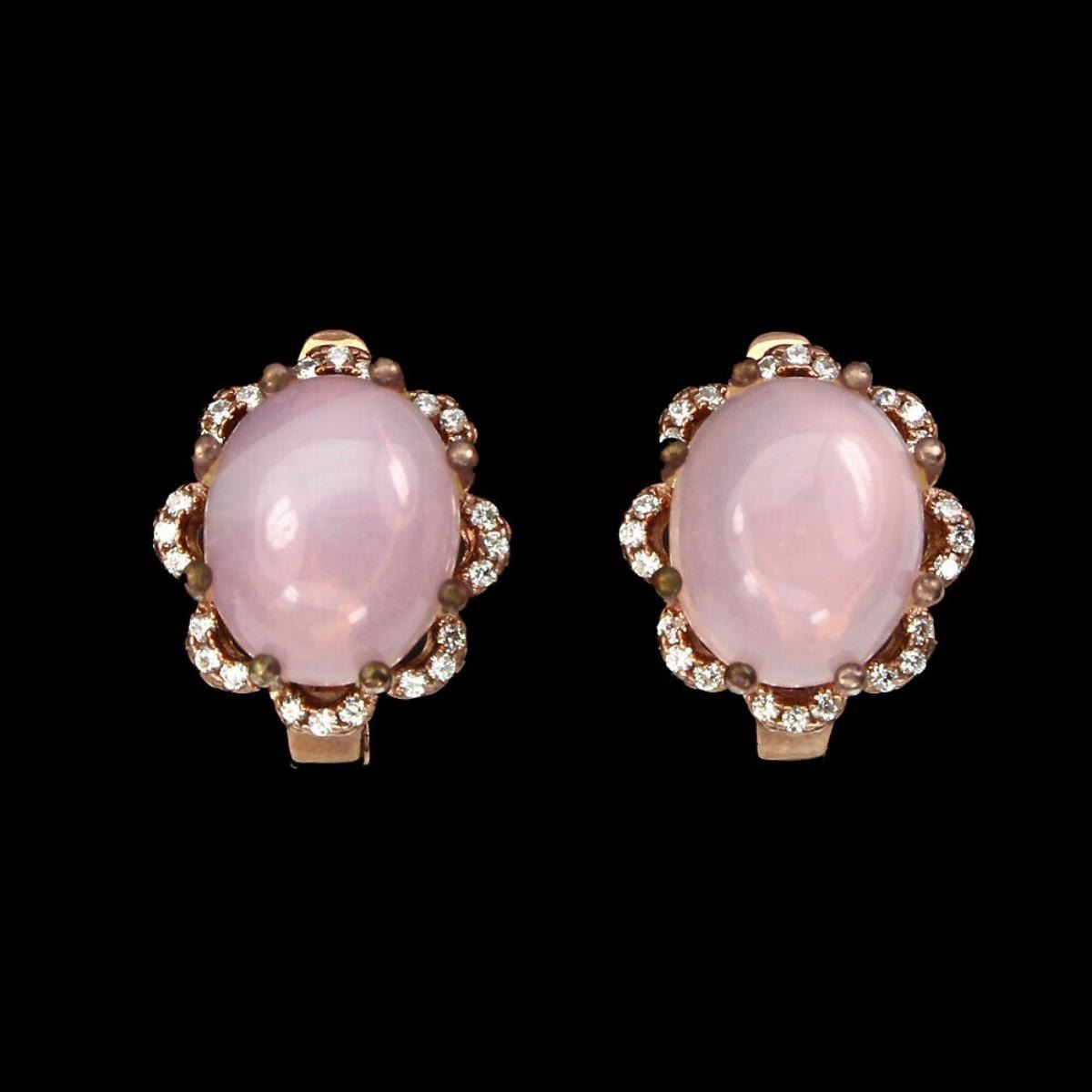 925 STERLING SILVER;;PLATE-14K ROSE GOLD;MAIN STONE-PINK OPAL;OTHER GEMS-CUBIC ZIRCONIA;TOTAL WEIGHT-33.32 CT (TOTAL WEIGHT OF SILVER + STONE)DIMENSION* STONE 12.0 X 10.0 MM. * CZ 1.0 MM. * FACE EARRINGS 14.0 X 13.0 MM.;MAIN STONE SHAPE-OVAL CABOCHON;MAIN STONE COLOR-TOP NICE PINK;CLARITY/GRADETRANSLUCENT;LUSTERRAVISHING;ORIGIN-ETHIOPIA;HARDNESS-5.5 - 6.5;