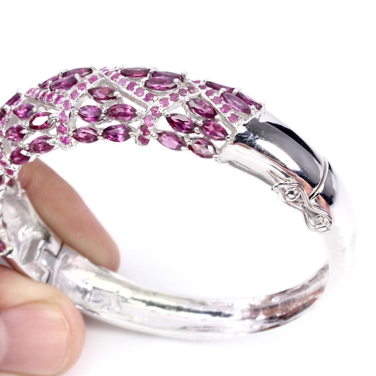 925 STERLING SILVER;PLATE14K WHITE GOLD;MAIN STONERHODOLITE GARNET;OTHER GEMSRUBY;TOTAL WEIGHT148.47 CT (TOTAL WEIGHT OF SILVER + STONE)DIMENSION* STONE 1.5 TO 5.0 X 2.5 MM. * DIAMETER 2.2 X 2.1 INCHES. * FACE BANGLE 62.0 X 15.0 MM.MAIN STONE SHAPEMARQUISE CUTMAIN STONE COLORTOP RICH PINK RASPBERRYCLARITY/GRADETRANSPARENTLUSTERPRECIOUSTREATMENTUNHEATEDORIGINAFRICAHARDNESS7.0 - 7.5