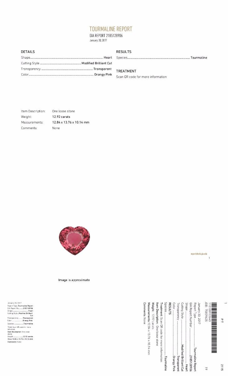 Natural Strawberry Pink Tourmaline Heart 12.92 Ct - VVS; Dimensions12.7x13.7x10.1; Shape - Happy Heart; Hardness - 7.5; Completely free from any kind of treatment; Origin - Nigeria; GIA certified.