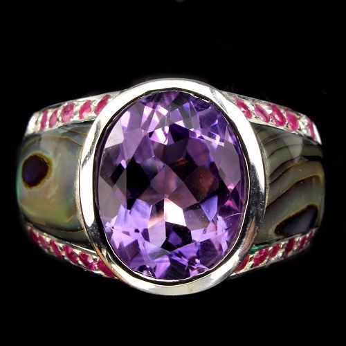 925 STERLING SILVER...........PLATE-14K WHITE GOLD;RING SIZE-9;MAIN STONE-AMETHYST;OTHER GEMS-MOTHER OF PEARL,RUBY;TOTAL WEIGHT-53.13 CT (TOTAL WEIGHT OF SILVER + STONE)DIMENSION* STONE 1.5 TO 12.0 X 10.0 MM. * MOP 10.0 X 8.0 MM. * FACE RING 22.0 X 15.0 MM.;MAIN STONE SHAPE-OVAL CUT;MAIN STONE COLOR-TOP RICH PURPLE;CLARITY/GRADE-IF TO VVS;LUSTER-GORGEOUS;TREATMENT-UNHEATED;ORIGIN-BRAZIL;HARDNESS-3.5 - 9.0