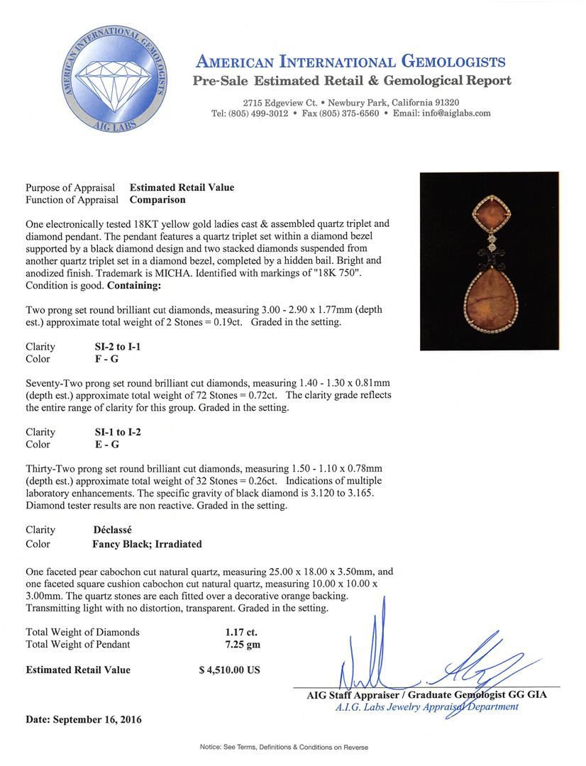 One electronically tested 18KT yellow gold ladies cast & assembled quartz triplet and diamond pendant. The pendant features a quartz triplet set within a diamond bezel supported by a black diamond design and two stacked diamonds suspended from another quartz triplet set in a diamond bezel, completed by a hidden bail. Bright and anodized finish. Trademark is MICHA. Identified with markings of '18K 750'. Condition is good. Containing: Two prong set round brilliant cut diamonds, measuring 3.00 - 2.90 x 1.77mm (depth est.) approximate total weight of 2 Stones = 0.19ct. Graded in the setting. Clarity SI-2 to I-1. Color: F - G Seventy-Two prong set round brilliant cut diamonds, measuring 1.40 - 1.30 x 0.81mm (depth est.) approximate total weight of 72 Stones = 0.72ct. The clarity grade reflects the entire range of clarity for this group. Graded in the setting. Clarity SI-1 to I-2. Color: E - G Thirty-Two prong set round brilliant cut diamonds, measuring 1.50 - 1.10 x 0.78mm (depth est.) approximate total weight of 32 Stones = 0.26ct. Indications of multiple laboratory enhancements. The specific gravity of black diamond is 3.120 to 3.165. Diamond tester results are non reactive. Graded in the setting. Clarity Déclassé, Color Fancy Black; Irradiated. One pear cabochon cut natural , measuring 25.00 x 18.00 x 3.50mm, approximate weight of 0.00ct. Transmitting light with no distortion, transparent. Graded in the setting. One square cushion cabochon cut natural , measuring 10.00 x 10.00 x 3.00mm, approximate weight of 0.00ct. Transmitting light with no distortion, transparent. Graded in the setting. Total Weight of Diamonds 1.17ct.. Total Weight of Pendant 7.25gm. AIG Appraised at $4,510.00.