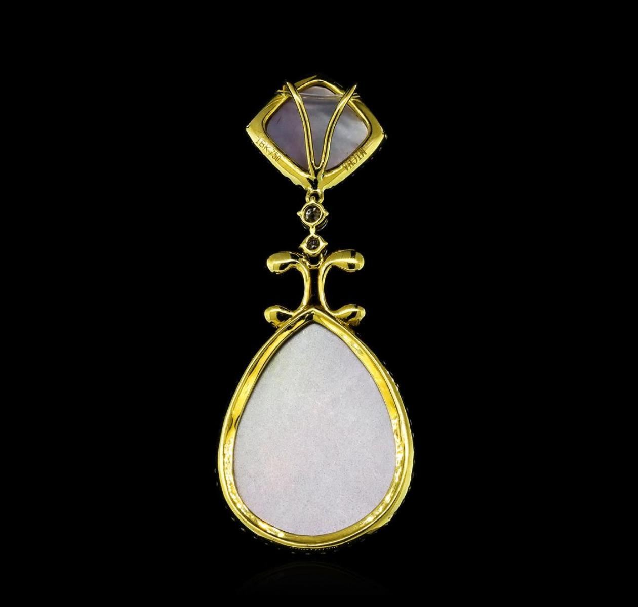 One electronically tested 18KT yellow gold ladies cast & assembled quartz triplet and diamond pendant. The pendant features a quartz triplet set within a diamond bezel supported by a black diamond design and two stacked diamonds suspended from another quartz triplet set in a diamond bezel, completed by a hidden bail. Bright and anodized finish. Trademark is MICHA. Identified with markings of '18K 750'. Condition is good. Containing: Two prong set round brilliant cut diamonds, measuring 3.00 - 2.90 x 1.77mm (depth est.) approximate total weight of 2 Stones = 0.19ct. Graded in the setting. Clarity SI-2 to I-1. Color: F - G Seventy-Two prong set round brilliant cut diamonds, measuring 1.40 - 1.30 x 0.81mm (depth est.) approximate total weight of 72 Stones = 0.72ct. The clarity grade reflects the entire range of clarity for this group. Graded in the setting. Clarity SI-1 to I-2. Color: E - G Thirty-Two prong set round brilliant cut diamonds, measuring 1.50 - 1.10 x 0.78mm (depth est.) approximate total weight of 32 Stones = 0.26ct. Indications of multiple laboratory enhancements. The specific gravity of black diamond is 3.120 to 3.165. Diamond tester results are non reactive. Graded in the setting. Clarity Déclassé, Color Fancy Black; Irradiated. One pear cabochon cut natural , measuring 25.00 x 18.00 x 3.50mm, approximate weight of 0.00ct. Transmitting light with no distortion, transparent. Graded in the setting. One square cushion cabochon cut natural , measuring 10.00 x 10.00 x 3.00mm, approximate weight of 0.00ct. Transmitting light with no distortion, transparent. Graded in the setting. Total Weight of Diamonds 1.17ct.. Total Weight of Pendant 7.25gm. AIG Appraised.