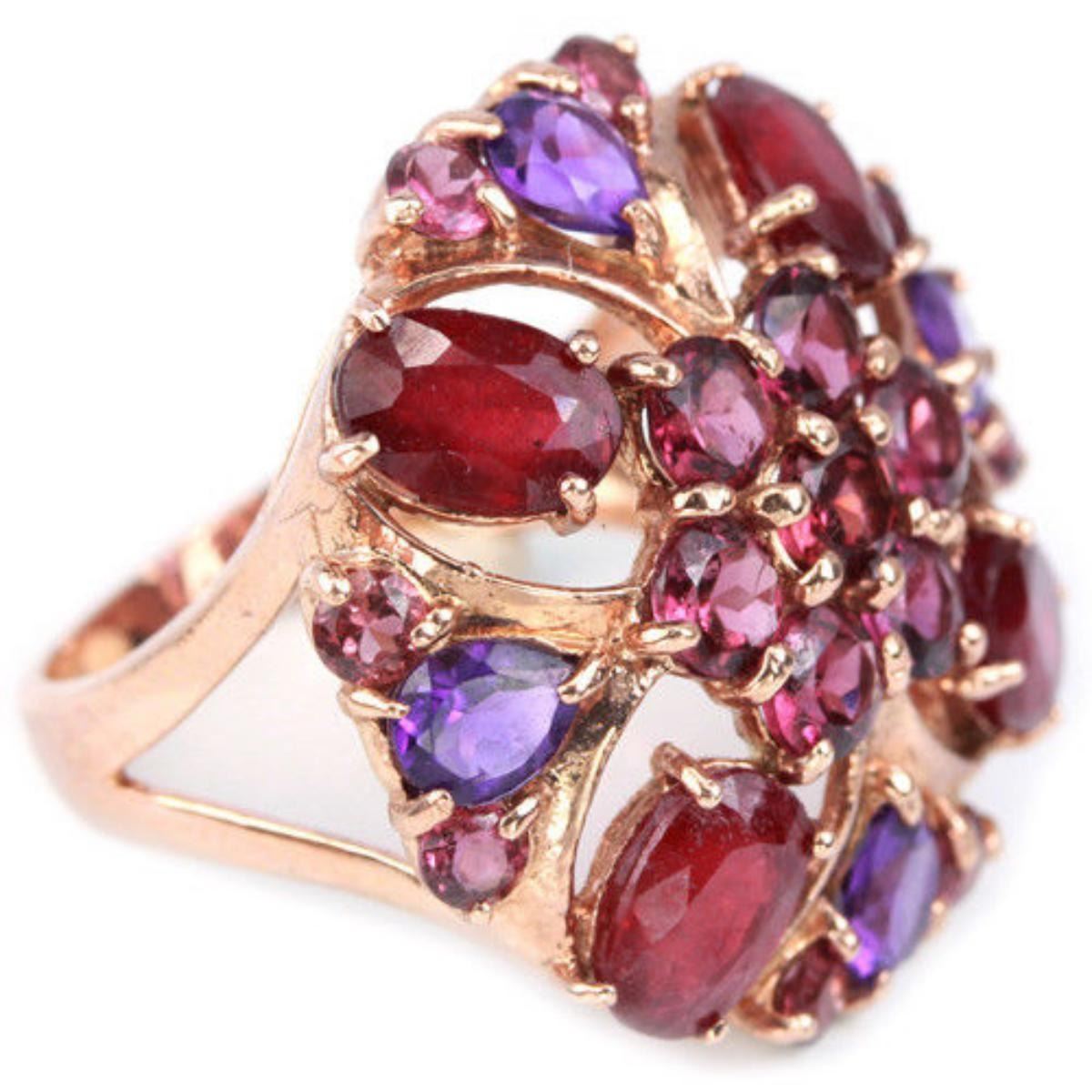 REAL RED RUBY AMETHYST RHODOLITE GARNET 925 SILVER RING 14K PINK GOLD COATING; RING SIZE 6.50 ( can be resized )ITEM QUANTITY1STONE SHAPEMIXED SHAPESTONE DIMENSION7 X 5 MM. , 5 X 4 MM. , 4 X 7 MM. 2.7 MM.ITEM WEIGHT6.53 GRAMCOLORMULTI COLORCLARITYTRANSLUCENT & VVS-VSLUSTERALLURINGTREATMENTHEATED & NATURAL UNHEATEDORIGIN OF STONEAFRICA & BRAZILHARDNESS7.5 - 9.0;FACE OF RING 25 X 25 MM.