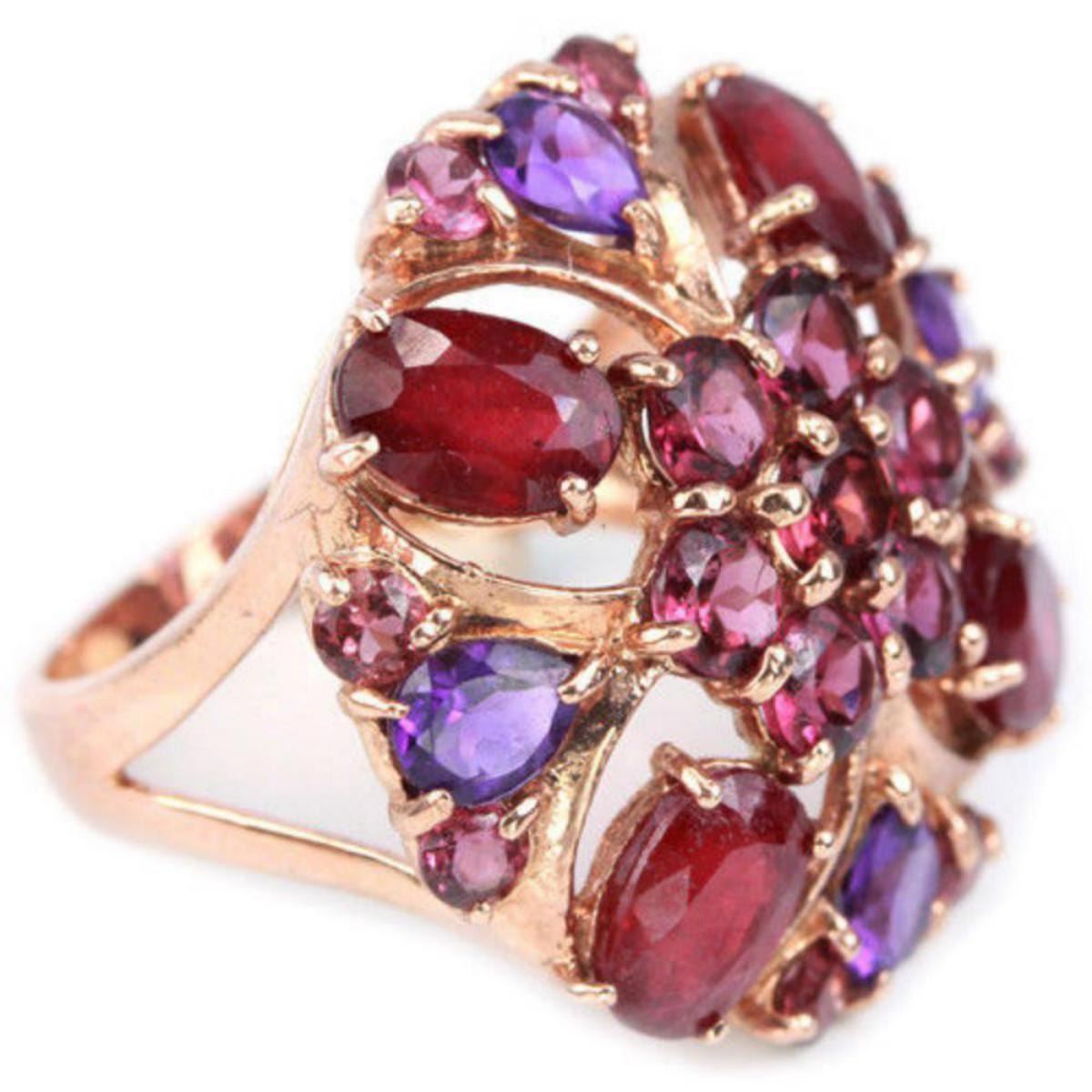 REAL RED RUBY AMETHYST RHODOLITE GARNET 925 SILVER RING 14K PINK GOLD COATING; RING SIZE 6.50 ( can be resized )ITEM QUANTITY1STONE SHAPEMIXED SHAPESTONE DIMENSION7 X 5 MM. , 5 X 4 MM. , 4 X 7 MM. 2.7 MM.ITEM WEIGHT6.53 GRAMCOLORMULTI COLORCLARITYTRANSLUCENT & VVS-VSLUSTERALLURINGTREATMENTHEATED & NATURAL UNHEATEDORIGIN OF STONEAFRICA & BRAZILHARDNESS7.5 - 9.0;FACE OF RING 25 X 25 MM.