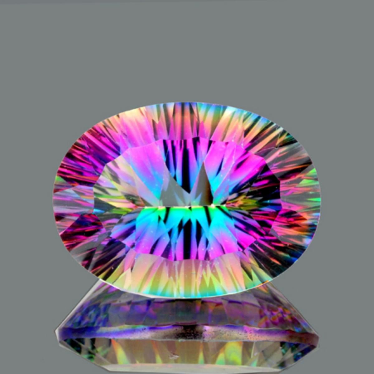 Natural Quartz; WEIGHT : 11.40 cts; SHAPE : Oval (Concave Cut) SIZE ( L x W x D ) : 18.00 x 13.00 mm; QUANTITY : 1 piece; COLOR : Rainbow Mystic; CLARITY : Flawless-VVS1 ; ORIGIN : Brazil; HARDNESS : 7; LUSTER : Excellent!!! TREATMENT : Yes;