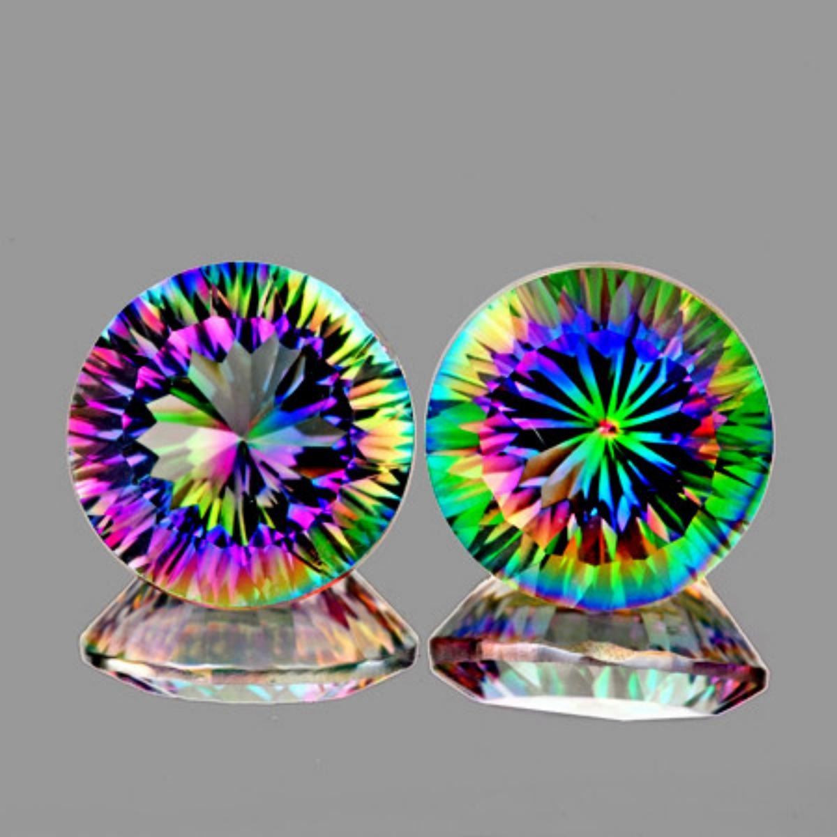 Natural Quartz; SHAPE : Round (Concave Cut); SIZE ( L x W x D ) : 13.00 mm; QUANTITY : 2 pieces (Perfect Matching Pair) COLOR : Rainbow Mystic AAA Color; CLARITY : Flawless-VVS ; AAA Grade; ORIGIN : Brazil; HARDNESS : 7; LUSTER : AAA Fire!!! TREATMENT : Treated;
