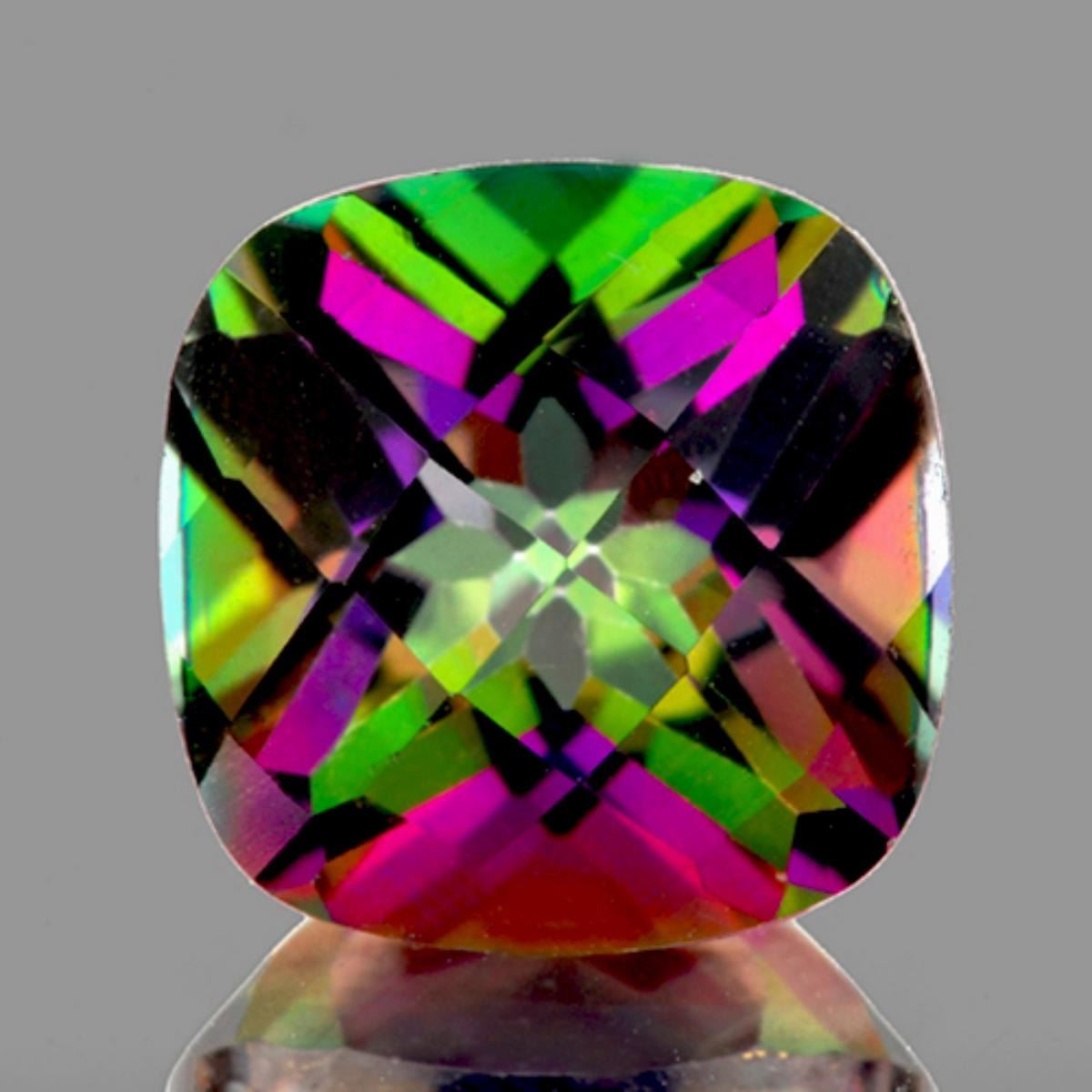 Natural Topaz WEIGHT : 13.00 cts (approx) SHAPE : Cushion Checker SIZE ( L x W x D ) : 14 mm QUANTITY : 1 piece COLOR : Rainbow Mystic AAA Color CLARITY : Flawless-VVS1 ORIGIN : Africa HARDNESS : 8 LUSTER : Excellent!!! TREATMENT : Treated