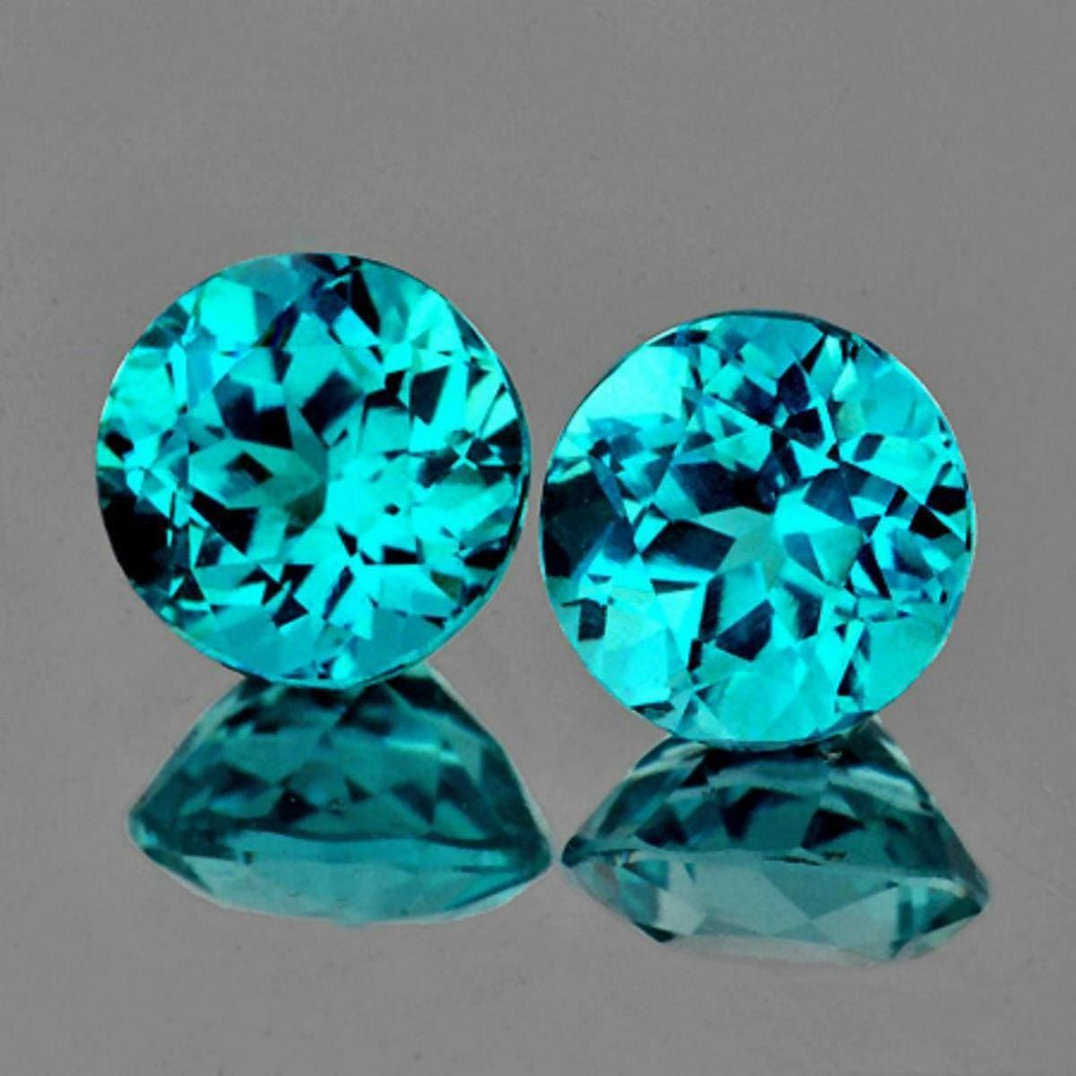 Natural Apatite..... ......... SHAPE : Round....... SIZE : 7.00 mm..... QUANTITY : 2 pieces(Perfectly Match Pair) COLOR : Paraiba Blue (slight greenish hue)....superb color CLARITY : VVS.... ORIGIN : Brazil.... HARDNESS : 5.... LUSTER : Excellent!!! TREATMENT : 100% Natural Unheated