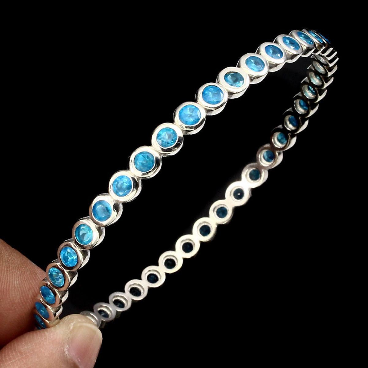 925 STERLING SILVER;PLATE14K WHITE GOLD;MAIN STONE...APATITE;OTHER GEMSTOTAL WEIGHT54.28 CT (TOTAL WEIGHT OF SILVER + STONE)DIMENSION* STONE 3.0 MM. * DIAMETER 2.2 X 2.1 INCHES. * FACE BANGLE 70.0 X 3.0 MM.MAIN STONE SHAPEROUND CUTMAIN STONE COLORAAA NEON BLUECLARITY/GRADEIF TO VVSLUSTERMESMERIZINGORIGINBrazil;HARDNESS5