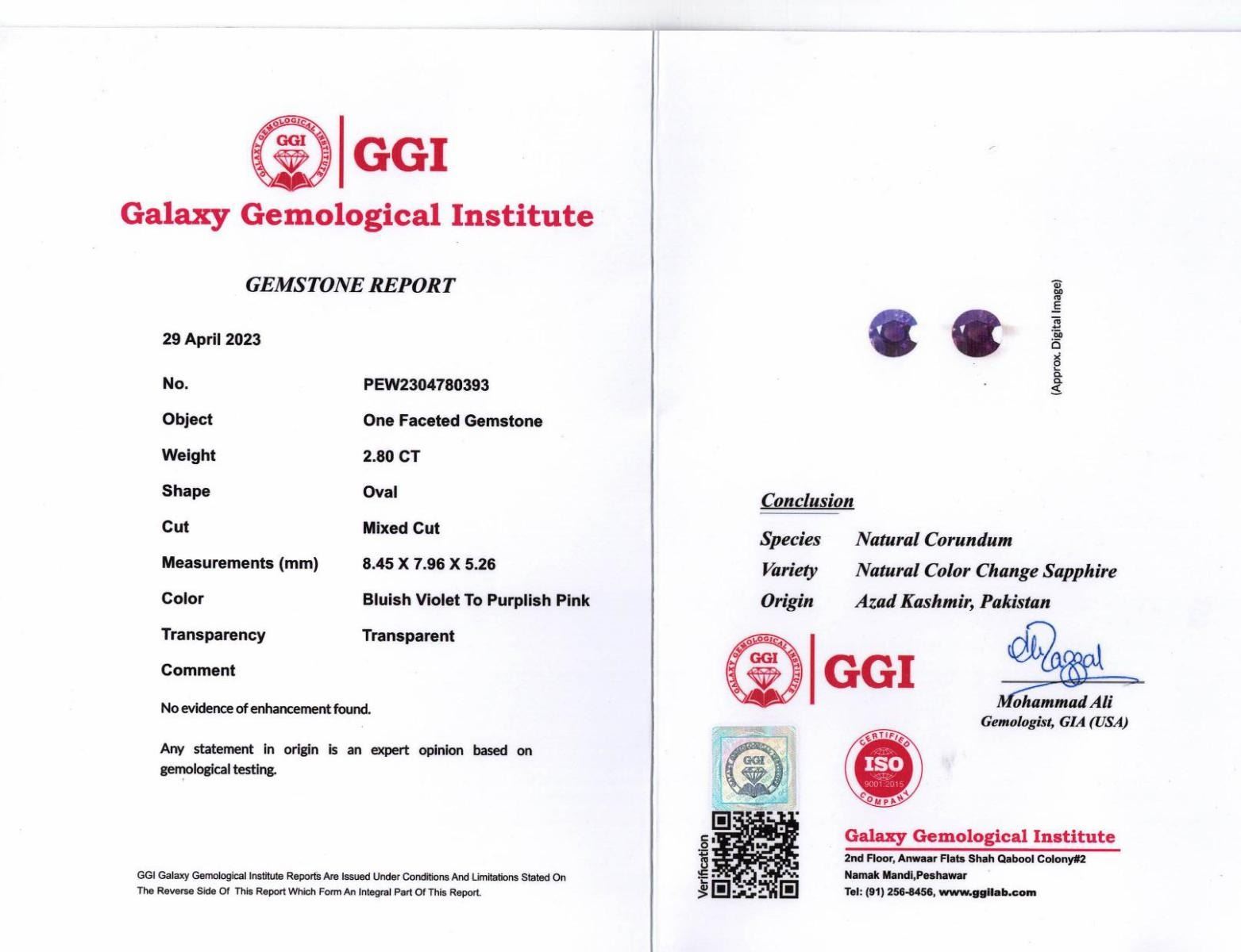Natural Rare Color Change Kashmir Sapphire - Untreated ....Weight 2.80 Cts ; Shape - Round; Color - Color Change as certificate specified; Origin - Kashmir ; Completely untreated in any way