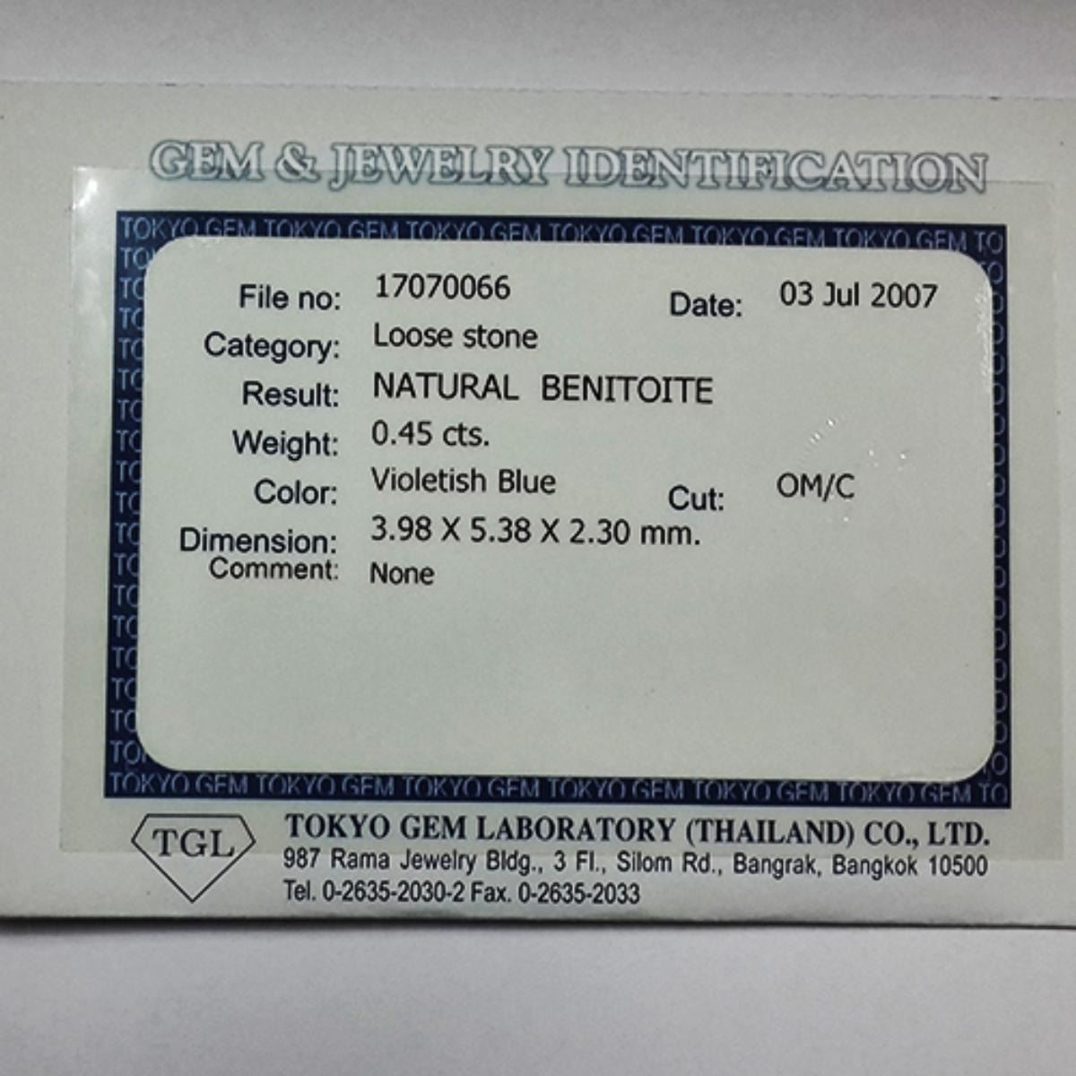 Natural Benitoite .... WEIGHT : 0.45 cts; SHAPE : Oval; SIZE ( L x W x D ) : 5.38 x 3.98 x 2.30 mm; QUANTITY : 1 piece; COLOR : AAA Royal Blue; CLARITY : VVS....Gem quality; ORIGIN : San Benito County, California USA, HARDNESS : 6 - 6.5 LUSTER : Excellent!!! TREATMENT : 100% Natural Unheated