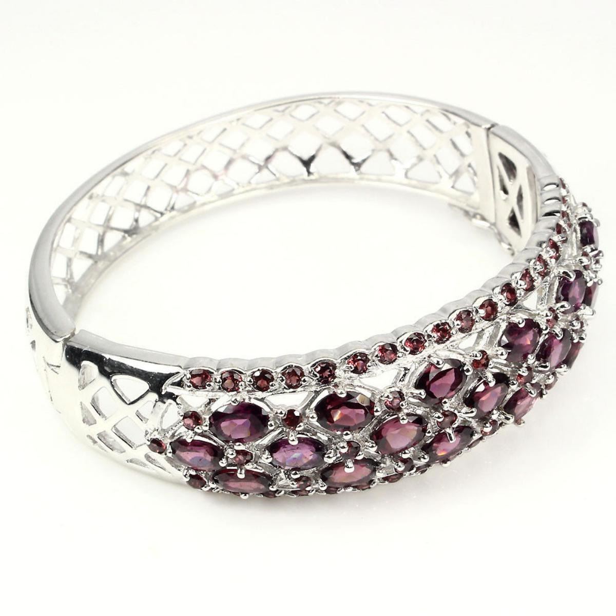 925 STERLING SILVER; PLATE -14K WHITE GOLD; MAIN STONE -RHODOLITE GARNET; OTHER GEMS -MOZAMBIQUE GARNET; TOTAL WEIGHT -132.39 CT (TOTAL WEIGHT OF SILVER + STONE) DIMENSION * STONE 2.0 TO 6.0 X 4.0 MM. * DIAMETER 2.0 INCHES. * FACE BANGLE 57.0 X 17.0 MM. MAIN STONE SHAPE OVAL CUT; MAIN STONE COLOR -TOP RICH PINK RASPBERRY; CLARITY/GRADE -IF TO VVS; LUSTER MESMERIZING TREATMENT -UNHEATED; ORIGIN AFRICA HARDNESS 7.0 - 7.5