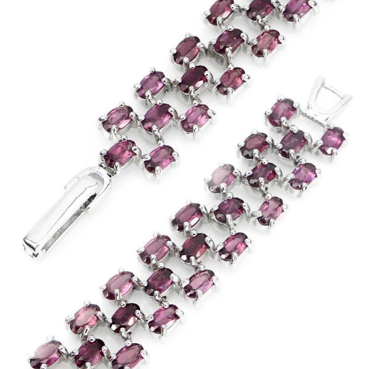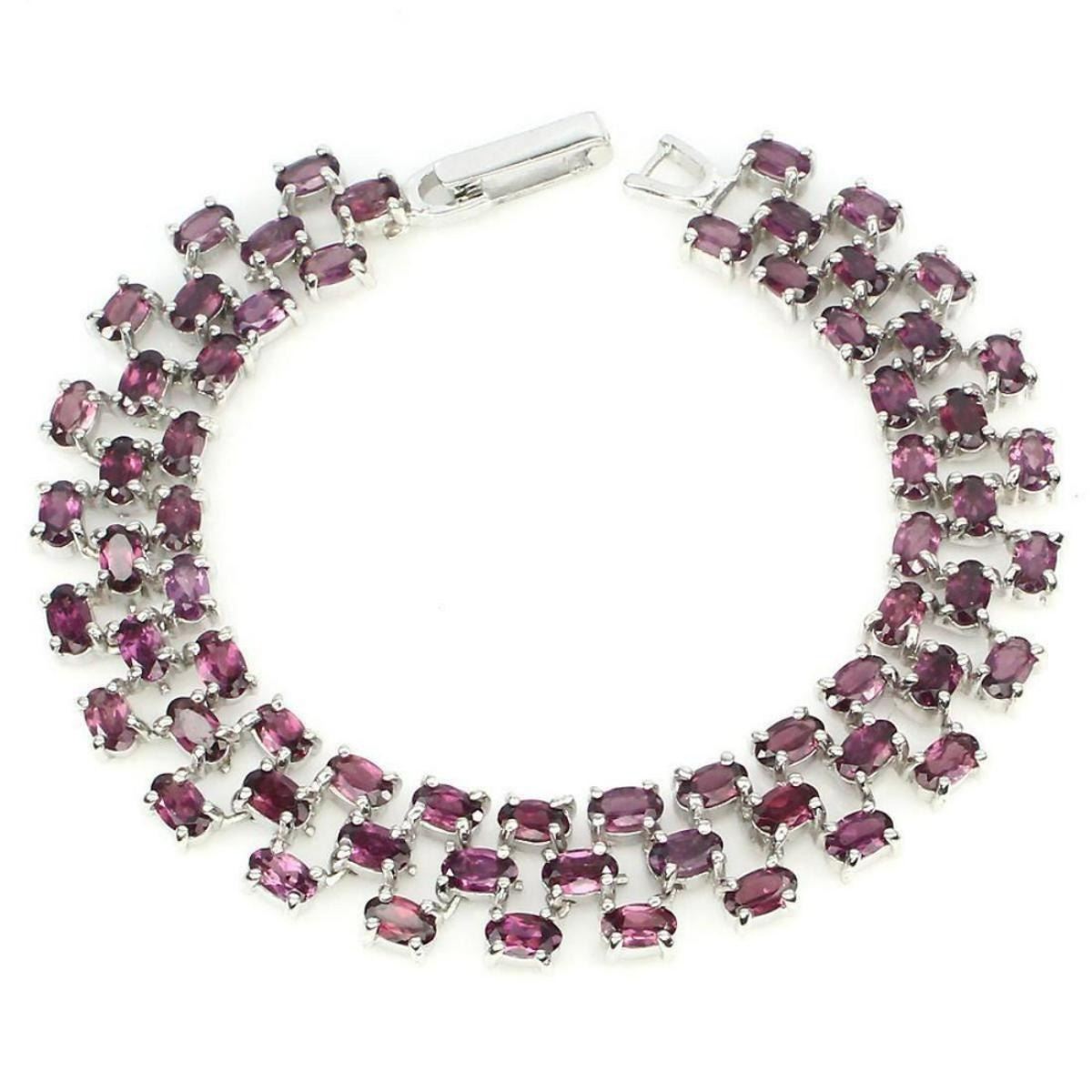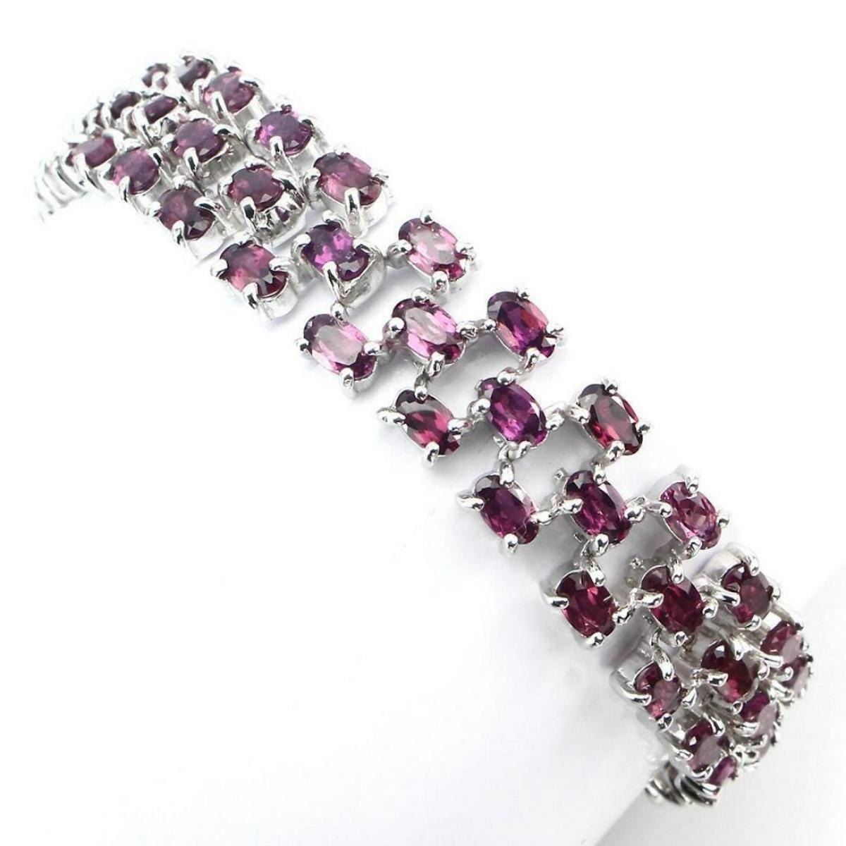 925 STERLING SILVER....PLATE....14K WHITE GOLD;LENGTH (INCHES)8;MAIN STONE-RHODOLITE GARNET;OTHER GEMSTOTAL WEIGHT-104.94 CT (TOTAL WEIGHT OF SILVER + STONE);DIMENSION* STONE 5.0 X 3.0 MM. * FACE BRACELET 163.0 X 12.0 MM.MAIN STONE SHAPE-OVAL CUT;MAIN STONE COLOR-TOP RICH PINK RASPBERRY;CLARITY/GRADE-IF TO VVS;TREATMENT-UNHEATED;ORIGIN-AFRICA;HARDNESS-7.0 - 7.5;
