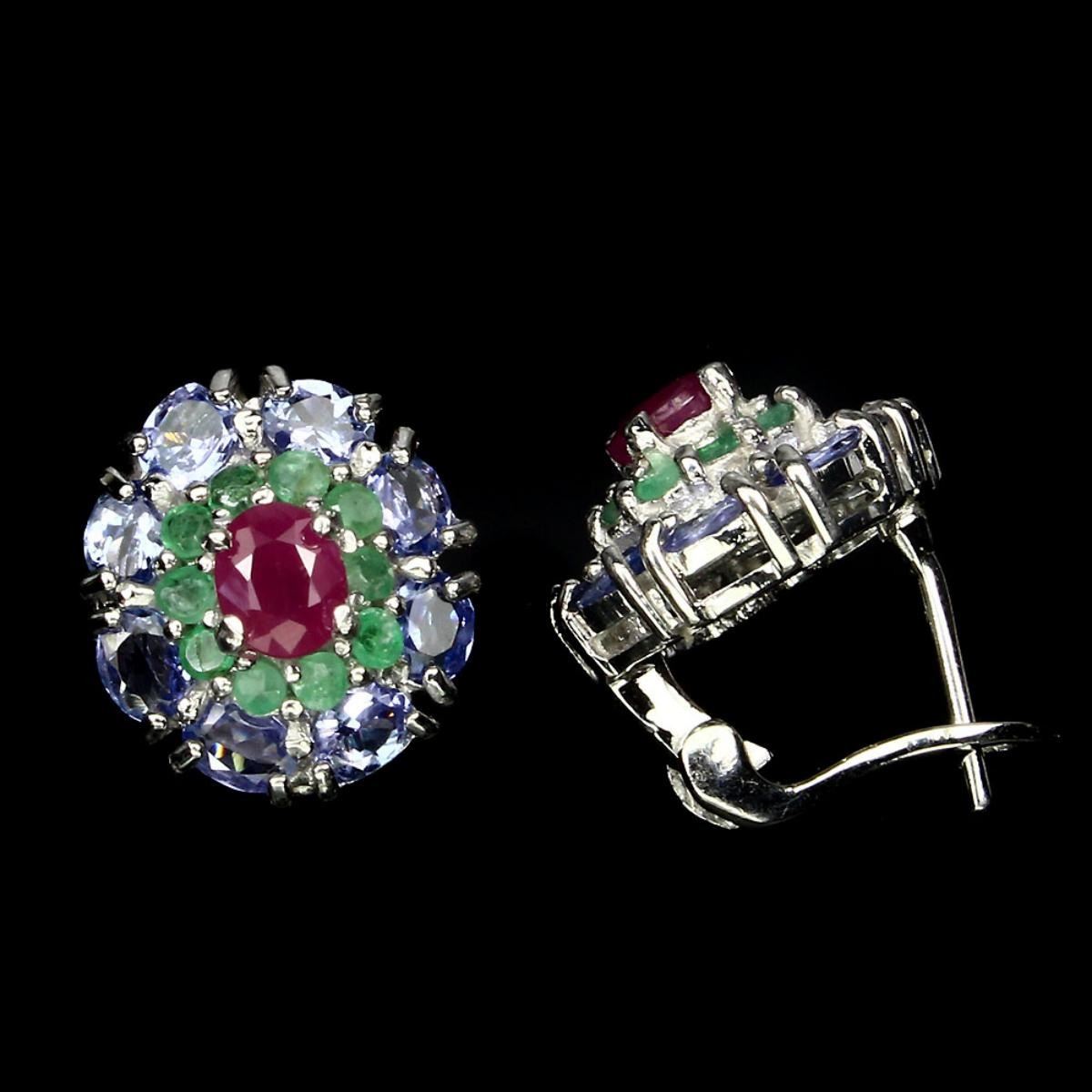Natural Red Pink Ruby Emerald & Tanzanite Earrings....14K WHITE GOLDMAIN STONERUBY;OTHER GEMSEMERALD,TANZANITE;TOTAL WEIGHT31.93 CT (TOTAL WEIGHT OF SILVER + STONE)DIMENSION* STONE 2.0 TO 5.0 X 4.0 MM. * FACE EARRINGS 15.0 X 14.0 MM.;MAIN STONE SHAPEOVAL CUT;MAIN STONE COLORTOP RICH RED PINK;CLARITY/GRADETRANSPARENT;LUSTERGORGEOUS;ORIGINMOZAMBIQUE;HARDNESS9;