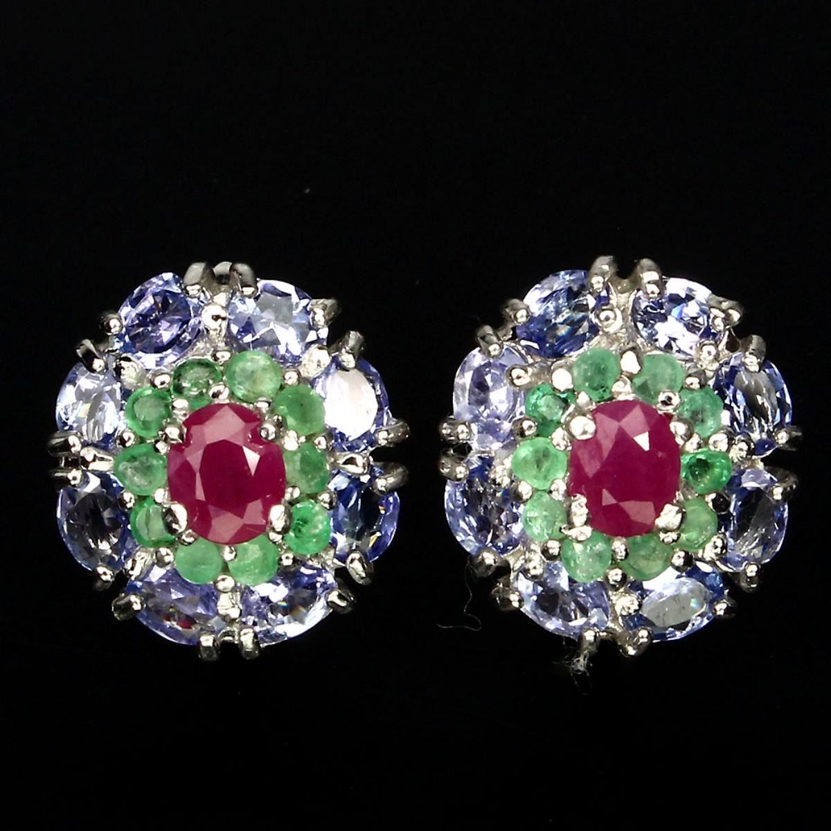 Natural Red Pink Ruby Emerald & Tanzanite Earrings....14K WHITE GOLDMAIN STONERUBY;OTHER GEMSEMERALD,TANZANITE;TOTAL WEIGHT31.93 CT (TOTAL WEIGHT OF SILVER + STONE)DIMENSION* STONE 2.0 TO 5.0 X 4.0 MM. * FACE EARRINGS 15.0 X 14.0 MM.;MAIN STONE SHAPEOVAL CUT;MAIN STONE COLORTOP RICH RED PINK;CLARITY/GRADETRANSPARENT;LUSTERGORGEOUS;ORIGINMOZAMBIQUE;HARDNESS9;