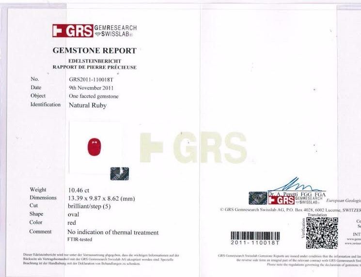 Natural Red Ruby 10.46 Carats - no Treatment in any way......Color -Red;....origin - Mozambique.... Certified by GRS swiss Lab