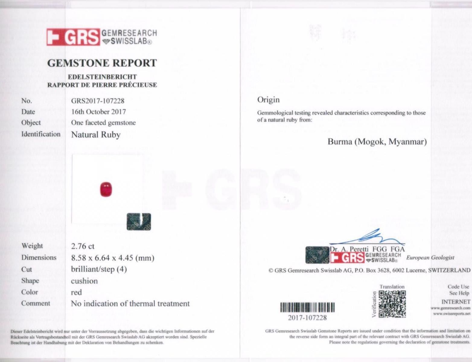 Natural Red Ruby Burma Origin 2.76 Cts - GRS Certified.....shape - Cushion......VS clarity....Top Red Color....Origin - Burma