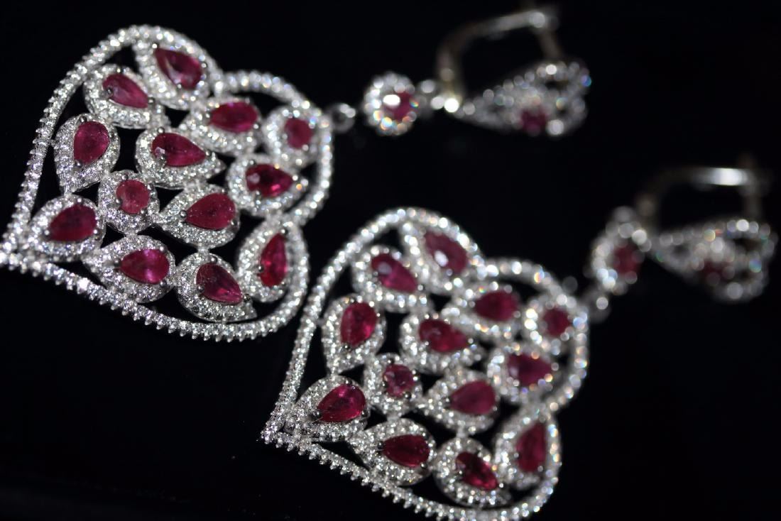 GENUINE RED RUBY WHITE CZ 925 SILVER EARRING 14K WHITE GOLD COATING;STONE SHAPE- PEAR ROUND FACET CUT; STONE DIMENSION- 5 X 3 MM. 3 MM.; ITEM WEIGHT -20.21 GRAM; COLOR - RED; TREATMENT -HEATED; ORIGIN OF STONE -AFRICA; HARDNESS -9.0; ;FACE OF EARRING 65 X 31 MM. WHITE CUBIC ZIRCONIA - 1 MM.