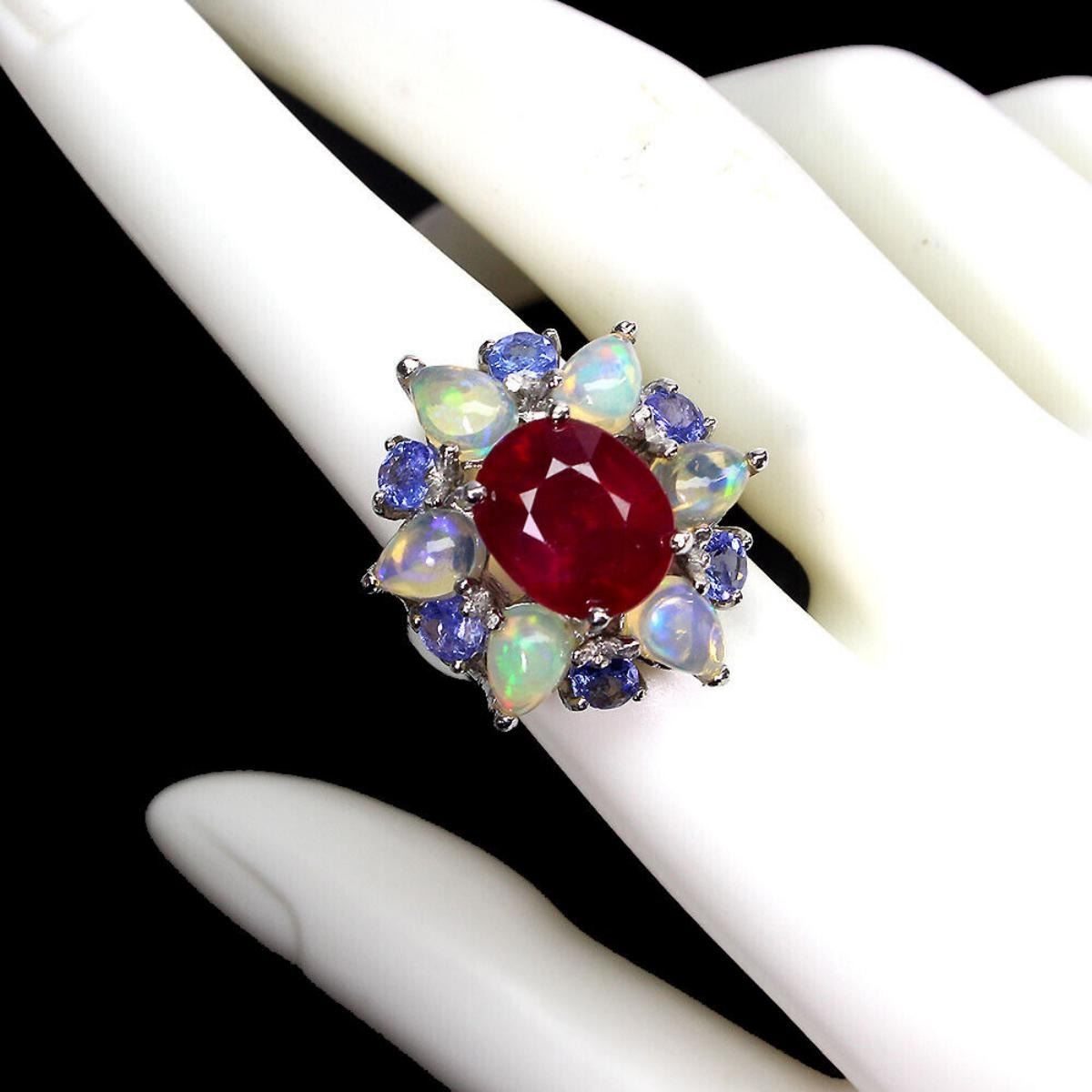 Natural Red Ruby Ethopian White Opal & Tanzanite Ring