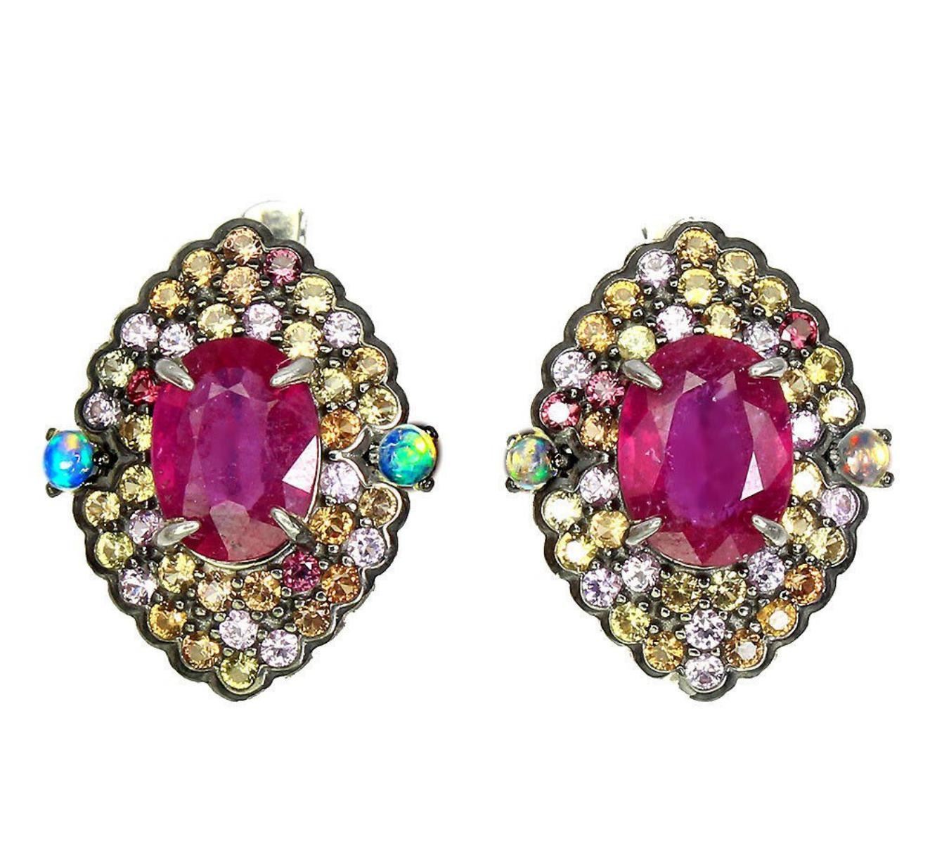 925 STERLING SILVER;PLATE-2-TONE BLACK RHODIUM & WHITE 14K GOLD;MAIN STONE-RUBY;OTHER GEMS-SAPPHIRE;TOTAL WEIGHT-5.24 GRAM (TOTAL WEIGHT OF SILVER + STONE)DIMENSION-* STONE 1.0 TO 8.0 X 6.0 MM.;* FACE EARRINGS- 17.0 X 14.0 MM.;MAIN STONE SHAPE-OVAL CUT;MAIN STONE COLOR- BLOOD RED;TREATMENT-Yes;ORIGIN-MADAGASCAR;HARDNESS-9;