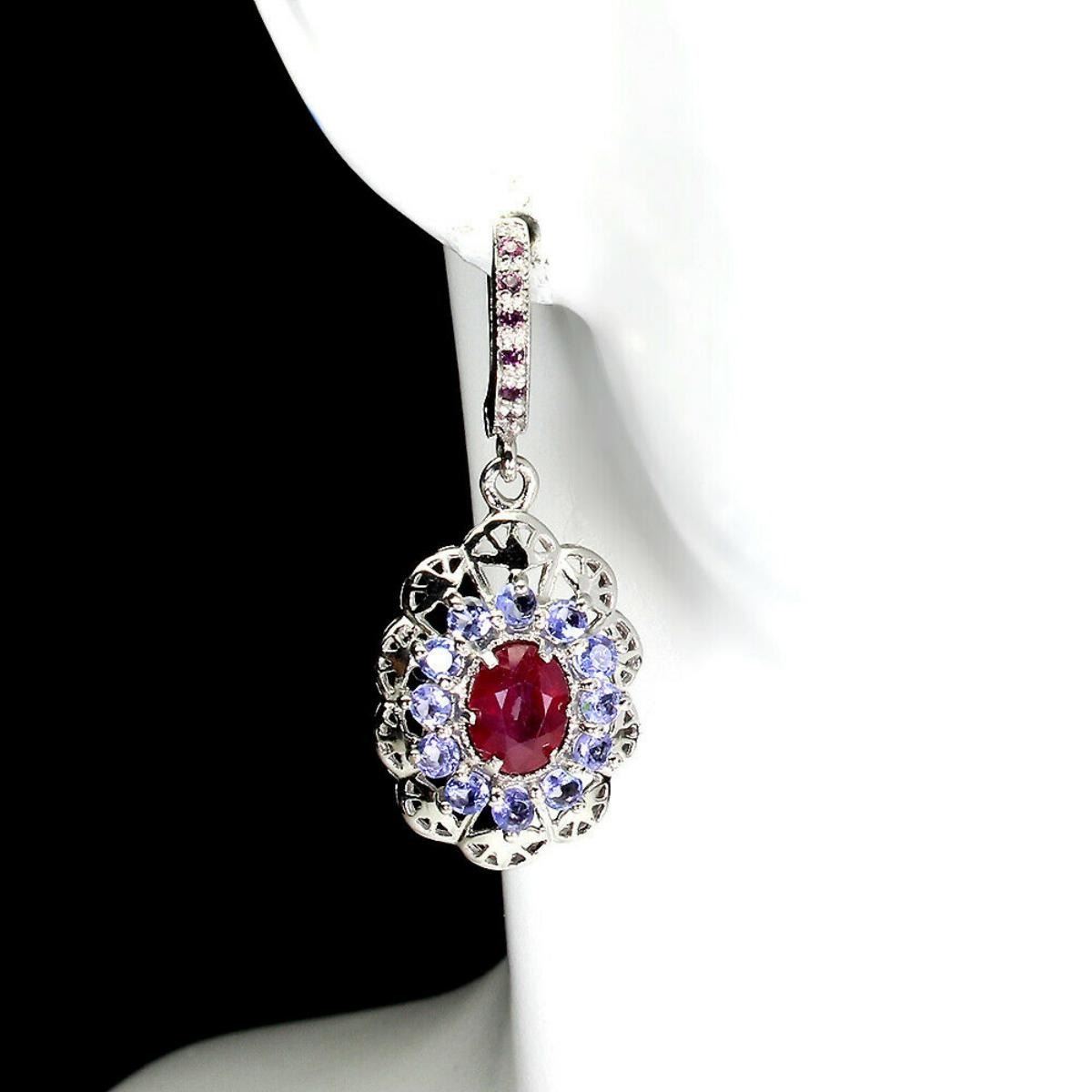 925 STERLING SILVER;PLATE-14K WHITE GOLD;MAIN STONE-RUBY;OTHER GEMS-RHODOLITE GARNET, TANZANITE;TOTAL WEIGHT-6.68 GRAM (TOTAL WEIGHT OF SILVER + STONE)DIMENSION-* STONE 1.5 TO 8.0 X 6.0 MM. * FACE EARRINGS 48.0 X 11.0 MM.;MAIN STONE SHAPE-OVAL CUT;MAIN STONE COLOR-BLOOD RED;TREATMENT-- Yes;ORIGIN-MADAGASCAR;HARDNESS-9;