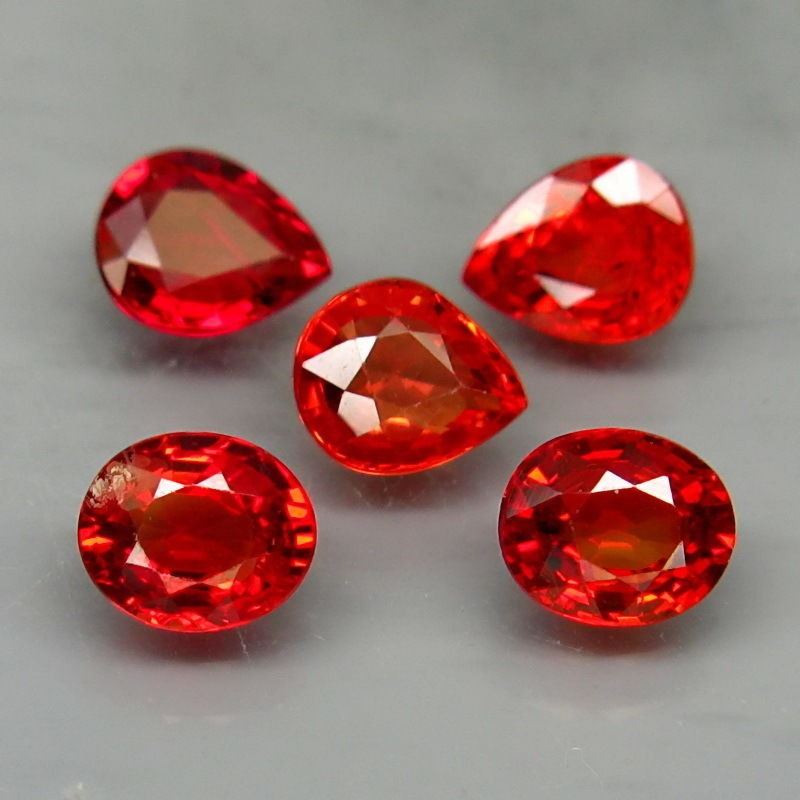 Natural SapphireSHAPE :Oval, Pear Shape;WEIGHT :3.00 Ct.;SIZE :5.5 X 4.5 Mm.QUANTITY :5 Pieces;COLOR :Imperial Red;CLARITY :Vs SiLUSTER :Superior;ORIGIN :Africa;TREATMENT : Heated;HARDNESS :9;