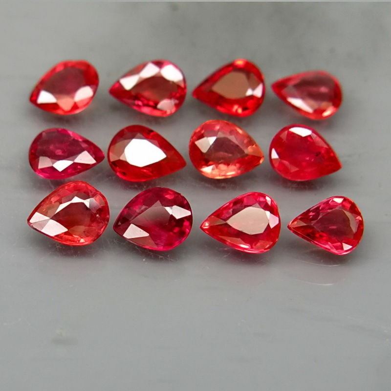 Natural SapphireSHAPE :Pear Shape;WEIGHT :4.00 Ct.;SIZE :5 X 4 Mm.;QUANTITY :12 Pieces;COLOR :Imperial Red;CLARITY :Vs Si;LUSTER :Superior;ORIGIN :Africa;TREATMENT : Heated;HARDNESS :9;