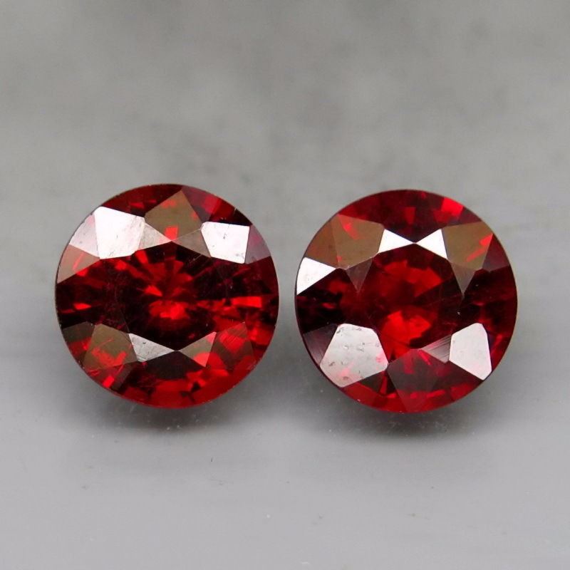 Garnet SpessartineSHAPE :Round;WEIGHT :2.45 Ct.;SIZE :6.5 Mm.;QUANTITY :2 Pieces;COLOR :Red;CLARITY :Si;LUSTER :Superior;ORIGIN :Africa;TREATMENT :None;HARDNESS :7-7.5;