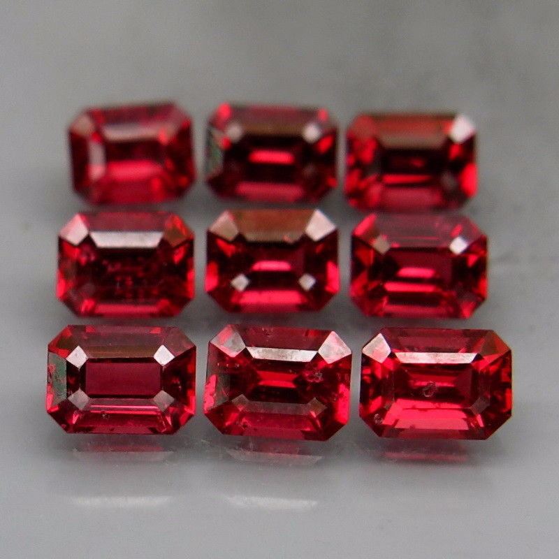 Spinel SHAPE Emerald Cut; WEIGHT 2.71 Ct.; SIZE 4x3 X to X 4.5x3.5 mm; QUANTITY 9 Pieces; Madgascar; COLOR Red; CLARITY VS SI; TREATMENT -None; HARDNESS 8