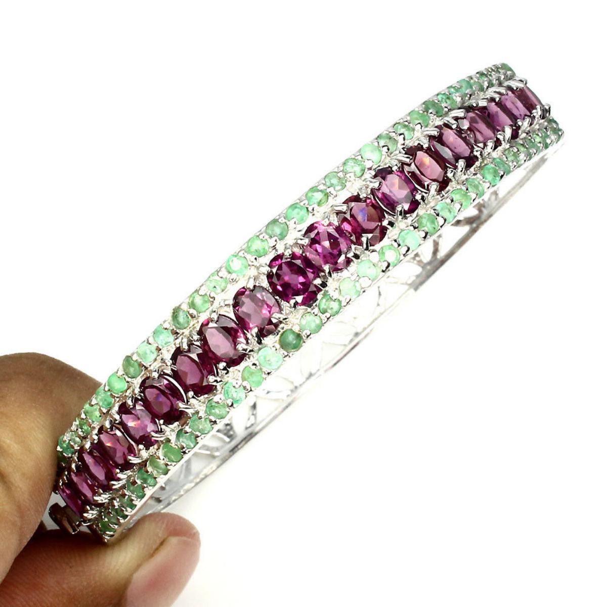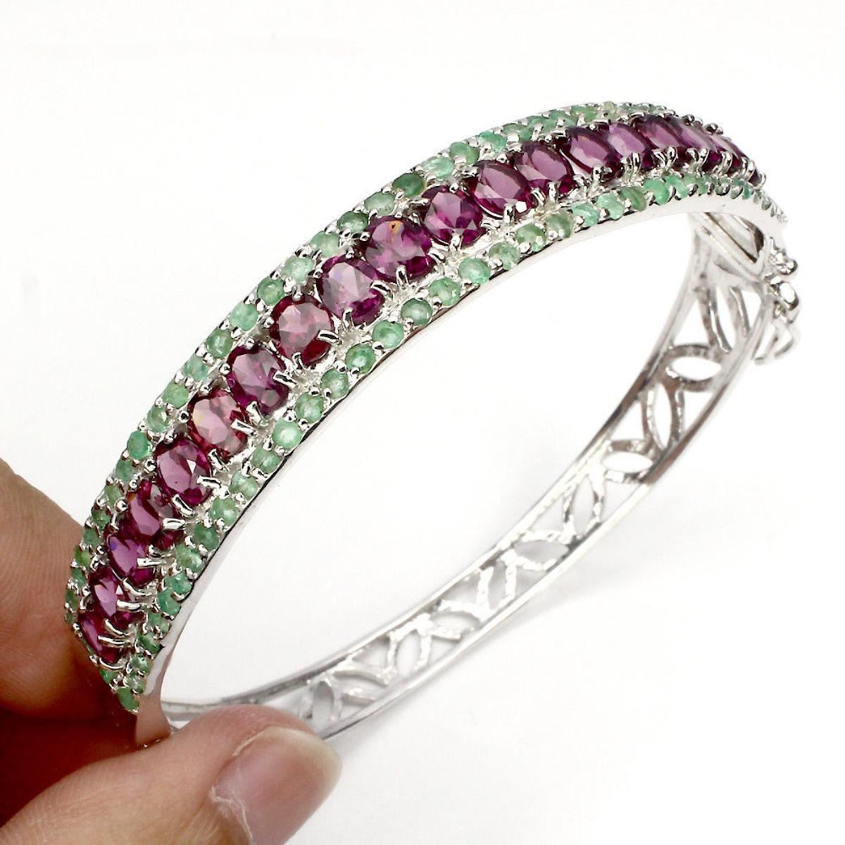 925 STERLING SILVER;PLATE14K WHITE GOLD;LENGTH (INCHES)2.3;MAIN STONERHODOLITE GARNET;OTHER GEMSEMERALD;TOTAL WEIGHT97.39 CT (TOTAL WEIGHT OF SILVER + STONE)DIMENSION* STONE 2.0 TO 5.0 X 4.0 MM. * DIAMETER 2.3 INCHES. * FACE BANGLE 62.0 X 11.0 MM.;;MAIN STONE SHAPEOVAL CUT;MAIN STONE COLORTOP RICH PINK RASPBERRY;CLARITY/GRADEIF TO VVSLUSTERGRACIOUSTREATMENTUNHEATEDORIGINAFRICA/ColumbiaHARDNESS7.0 - 8.0