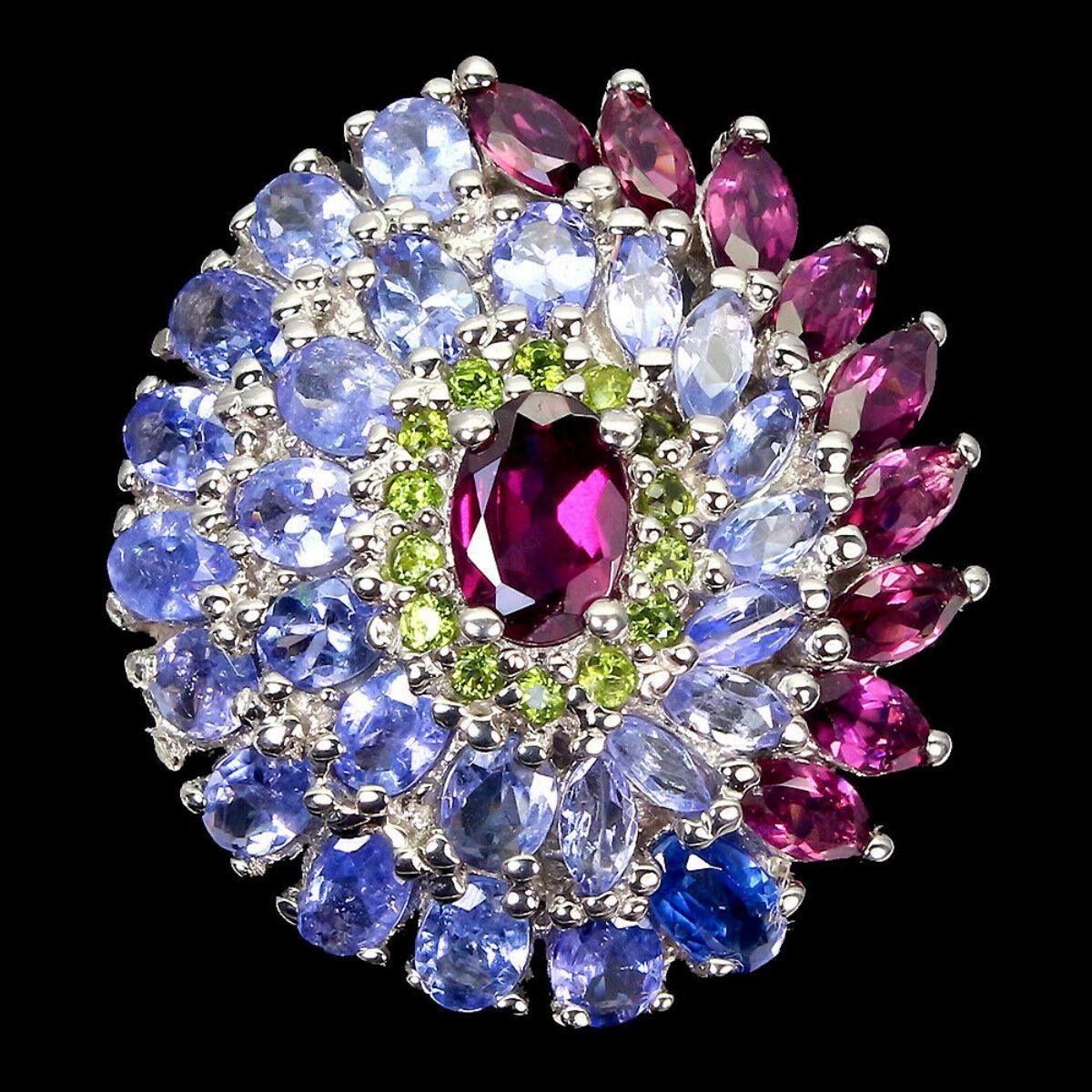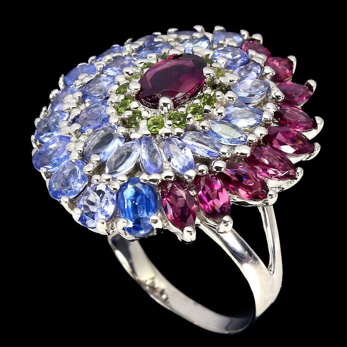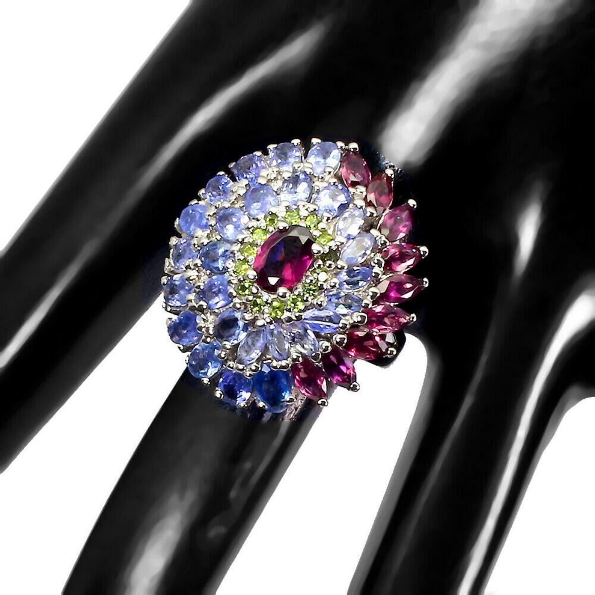 925 STERLING SILVER;PLATE-14K WHITE GOLD;RING SIZE(resizeable)8;MAIN STONE-RHODOLITE GARNET;OTHER GEMS-CHROME DIOPSIDE, RHODOLITE GARNET, TANZANITE;TOTAL WEIGHT-9.38 GRAM (TOTAL WEIGHT OF SILVER + STONE)DIMENSION-* STONE 1.5 TO 7.0 X 5.0 MM. * RING SIZE 8.0 * FACE RING- 27.0 X 24.0 MM.;MAIN STONE SHAPE-OVAL CUT;MAIN STONE COLOR- RICH PINK RASPBERRY;CLARITY/GRADE-IF TO VVS;TREATMENT-UNHEATED;ORIGIN-AFRICA;HARDNESS-7.0 - 7.5;