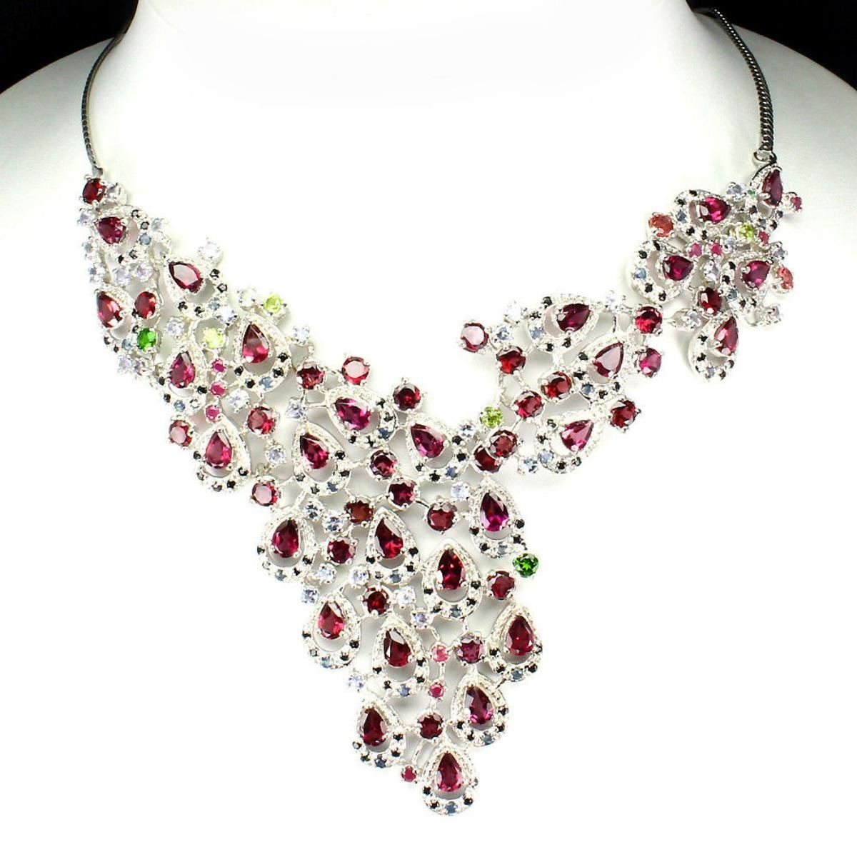 925 STERLING SILVER; PLATE -14K WHITE GOLD; LENGTH (INCHES) -18; MAIN STONE -RHODOLITE GARNET; OTHER GEMS -CHROME DIOPSIDE,PERIDOT,RUBY,SAPPHIRE,SPINEL,TANZANITE; TOTAL WEIGHT 216.07 CT (TOTAL WEIGHT OF SILVER + STONE) DIMENSION * STONE 1.0 TO 6.0 X 4.0 MM. * STONES PART LENGTH 120.0 X 72.0 MM. MAIN STONE SHAPE PEAR CUT MAIN STONE COLOR TOP RICH PINK RASPBERRY CLARITY/GRADE IF TO VVS LUSTER LUXURIOUS TREATMENT UNHEATED ORIGIN AFRICA HARDNESS 6.5 - 9.0
