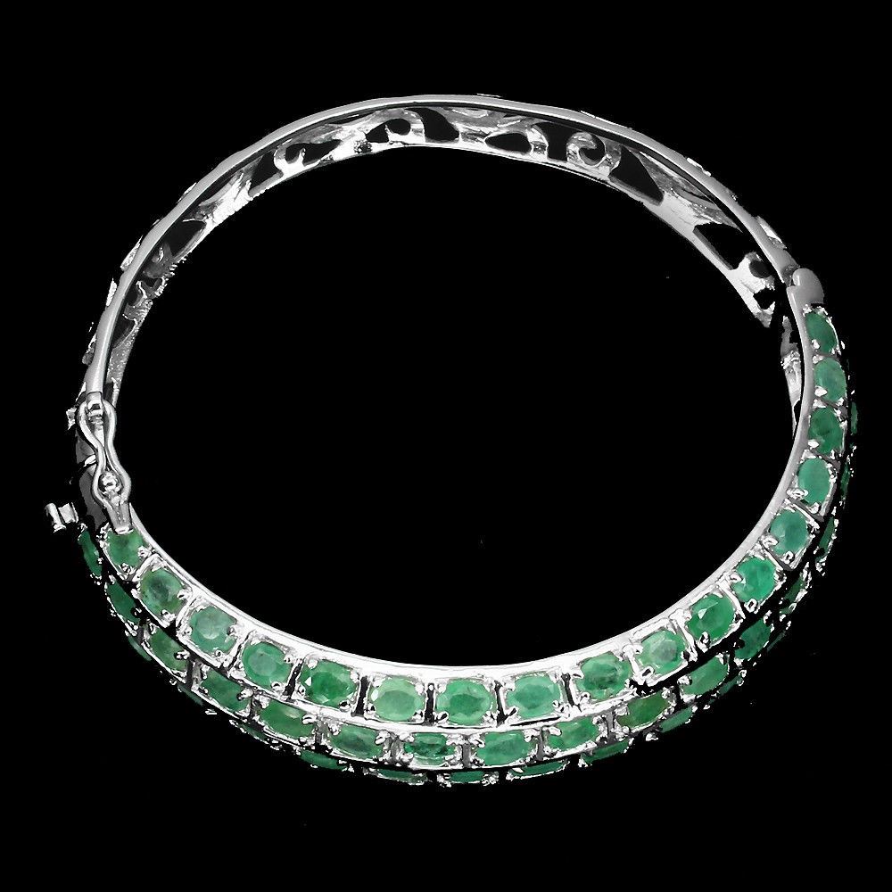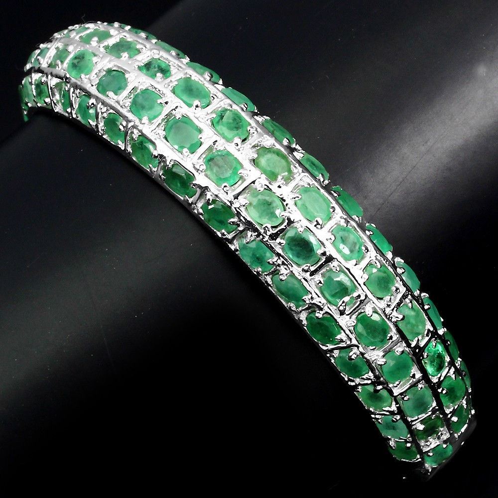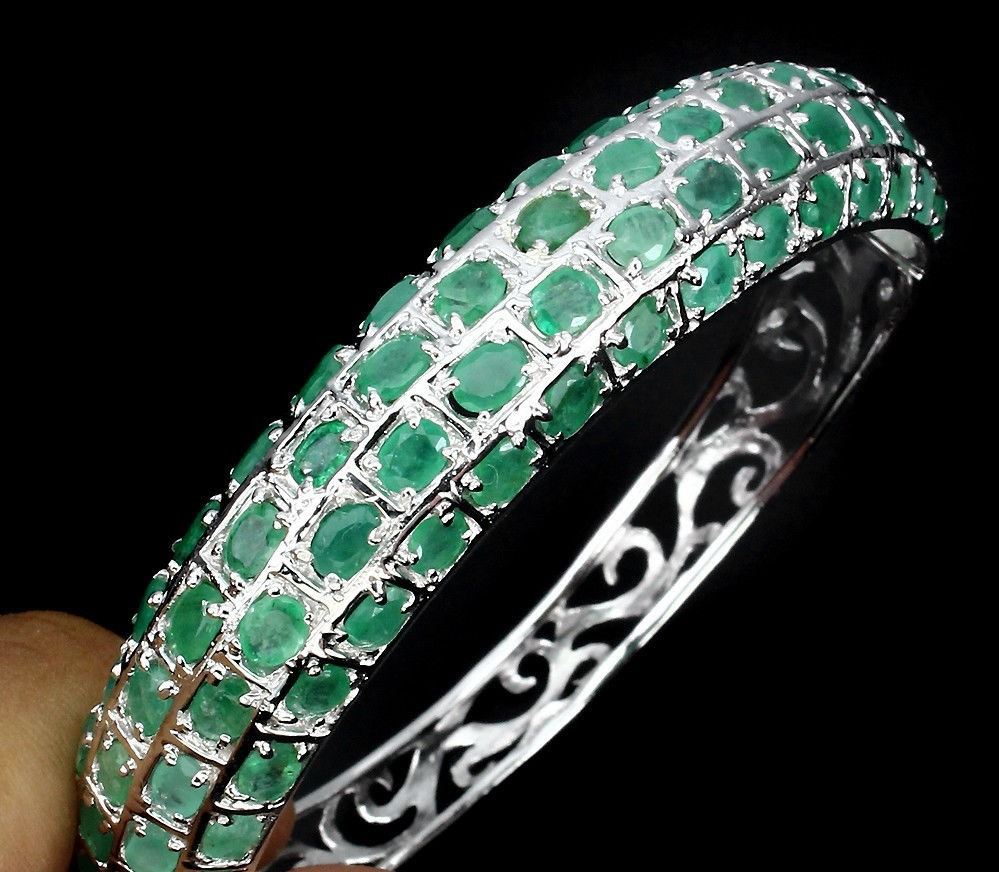 925 STERLING SILVER PLATE 14K WHITE GOLD LENGTH (INCHES) 2; MAIN STONE -EMERALD; TOTAL WEIGHT 122.40 CT (TOTAL WEIGHT OF SILVER + STONE) DIMENSION * STONE 4.0 X 3.0 MM. * DIAMETER 2.0 INCHES. * FACE BANGLE 65.0 X 12.0 MM. MAIN STONE SHAPE -OVAL CUT; MAIN STONE COLOR --TOP RICH GREEN; CLARITY/GRADE -TRANSPARENT; LUSTER -MESMERIZING; TREATMENT -UNHEATED; ORIGIN -BRAZIL; HARDNESS -7.5 - 8.0;