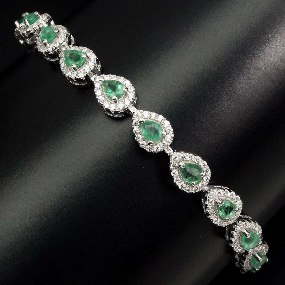 925 STERLING SILVER;PLATE14K WHITE GOLD;LENGTH (INCHES)10;MAIN STONEEMERALDOTHER GEMSCUBIC ZIRCONIATOTAL WEIGHT46.30 CT (TOTAL WEIGHT OF SILVER + STONE)DIMENSION* STONE 4.0 X 3.0 MM. * CZ 1.0 MM. * FACE BRACELET 95.0 X 6.0 MM.MAIN STONE SHAPEPEAR CUTMAIN STONE COLORTOP RICH GREENCLARITY/GRADETRANSPARENTLUSTEREXQUISITETREATMENTUNHEATEDORIGINBRAZILHARDNESS7.5 - 8.0