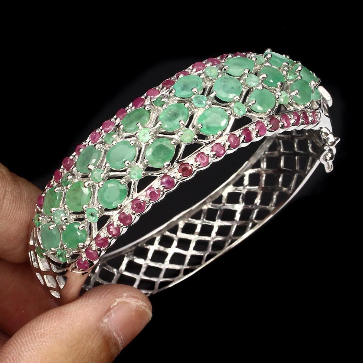 925 STERLING SILVER;PLATE14K WHITE GOLD;MAIN STONEEMERALD;OTHER GEMSRUBY;TOTAL WEIGHT127.37 CT (TOTAL WEIGHT OF SILVER + STONE)DIMENSION* STONE 2.0 TO 5.0 X 3.0 MM. * DIAMETER 2.1 X 2.0 INCHES. * FACE BANGLE 58.0 X 17.0 MM.MAIN STONE SHAPEOVAL CUTMAIN STONE COLORTOP RICH GREENCLARITY/GRADETRANSPARENTLUSTERLUXURIOUSTREATMENTUNHEATEDORIGINBRAZILHARDNESS7.5 - 9.0