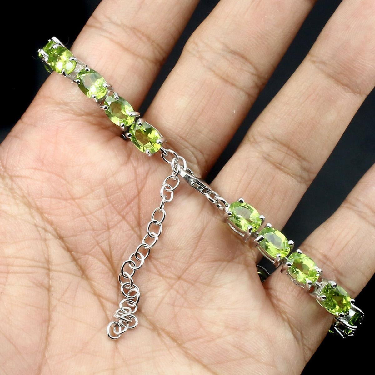 925 STERLING SILVER;PLATE14K WHITE GOLD;LENGTH (INCHES)9.5;MAIN STONEPERIDOT;TOTAL WEIGHT69.06 CT (TOTAL WEIGHT OF SILVER + STONE)DIMENSION* STONE 7X5 MM. * FACE BRACELET 170.0 X 5.0 MM.MAIN STONE SHAPEOVAL CUTMAIN STONE COLORTOP RICH GREENCLARITY/GRADEIF TO VVS;LUSTERPRECIOUS;TREATMENTUNHEATED;ORIGINPAKISTAN;HARDNESS6.5 - 7.0