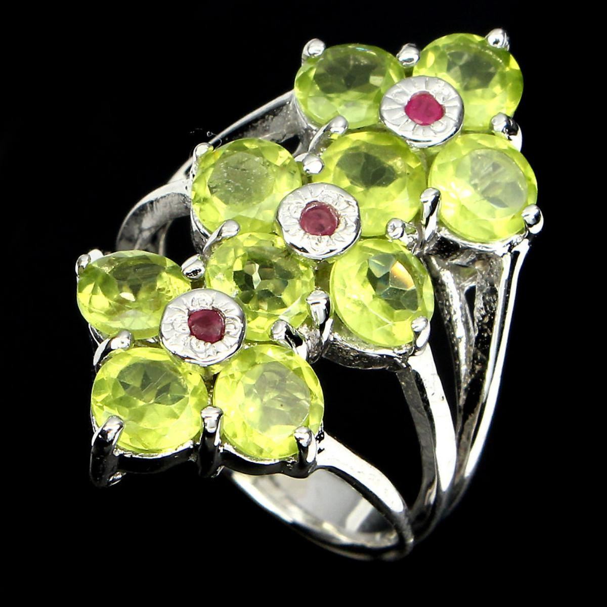 925 STERLING SILVER;PLATE-14K WHITE GOLD;RING SIZE-7;MAIN STONE-PERIDOT;OTHER GEMS-RUBY;TOTAL WEIGHT-42.98 CT (TOTAL WEIGHT OF SILVER + STONE)DIMENSION* STONE 1.5 TO 4.5 MM. * FACE RING 29.0 X 14.0 MM.MAIN STONE SHAPE-ROUND CUTMAIN STONE COLOR-TOP RICH GREEN;CLARITY/GRADE-IF TO VVS;TREATMENT-UNHEATED;ORIGIN-PAKISTAN;HARDNESS-6.5 - 9.0