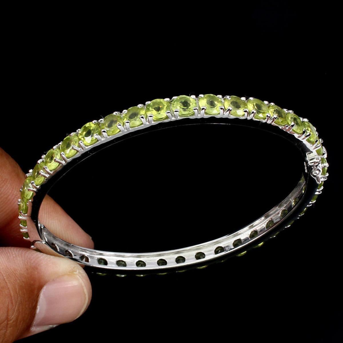 925 STERLING SILVER;PLATE14K WHITE GOLD;;MAIN STONE...PERIDOT;OTHER GEMSTOTAL WEIGHT..93.70 CT (TOTAL WEIGHT OF SILVER + STONE)DIMENSION* STONE 5.0 MM. * DIAMETER 2.3 X 2.1 INCHES. * FACE BANGLE 67.0 X 5.0 MM.MAIN STONE SHAPEROUND CUT;MAIN STONE COLORTOP RICH GREEN;CLARITY/GRADEIF TO VVS;LUSTERPRECIOUS;TREATMENTUNHEATED;ORIGINPAKISTAN;HARDNESS6.5 - 7.0;