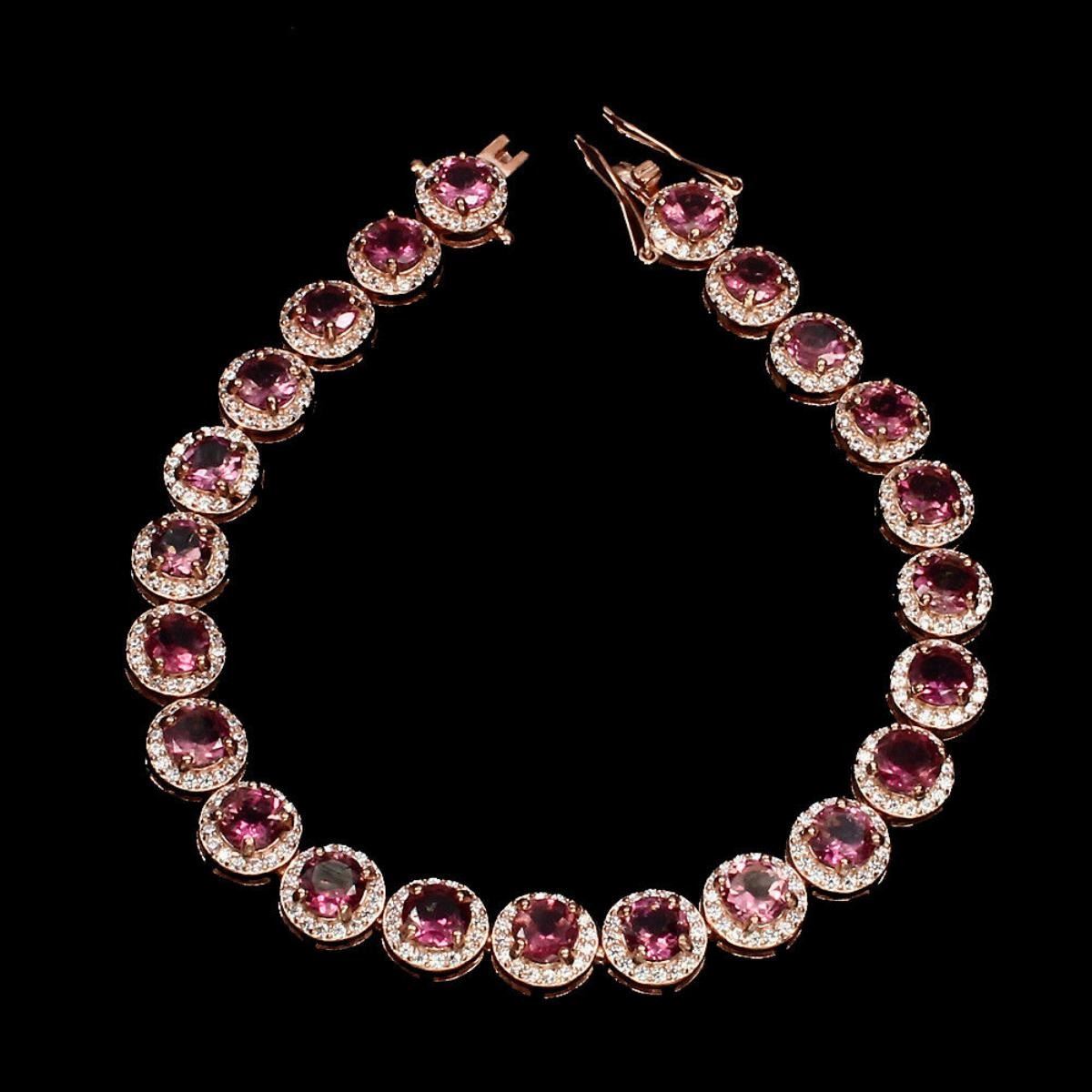 925 STERLING SILVER;PLATE14K ROSE GOLD;LENGTH (INCHES)8;MAIN STONETOURMALINE;OTHER GEMSCUBIC ZIRCONIA;TOTAL WEIGHT72.18 CT (TOTAL WEIGHT OF SILVER + STONE)DIMENSION* STONE 5.0 MM. * CZ 1.0 MM. * FACE BRACELET 190.0 X 8.0 MM.MAIN STONE SHAPEROUND CUTMAIN STONE COLORTOP RICH PINKCLARITY/GRADEIF TO VVSLUSTERPRECIOUSTREATMENTUNHEATEDORIGINBRAZILHARDNESS7.0 - 7.5