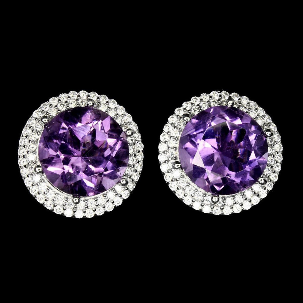 925 STERLING SILVER;PLATE-14K WHITE GOLD;MAIN STONE-AMETHYST;OTHER GEMS-CUBIC ZIRCONIA;TOTAL WEIGHT-8.12 GRAM (TOTAL WEIGHT OF SILVER + STONE)DIMENSION* STONE 12.0 MM. * CZ 1.0 MM. * FACE EARRINGS 17.0 MM.;MAIN STONE SHAPE-ROUND CUT;MAIN STONE COLOR-TOP RICH PURPLE;CLARITY/GRADE-IF TO VVS;TREATMENT-UNHEATED;ORIGIN-BRAZIL;HARDNESS-7;