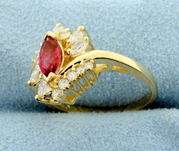 In 14k Yellow Gold. The center natural marquise rubellite garnet is 4mm x 8mm, approx. weight of 0.75ct with an intense pinkish red color and excellent clarity. There are 16 high quality diamonds (4 marquise, 12 round), H color/I clarity. Total diamond weight is 1/2 carat. Size 6.5 4.5g