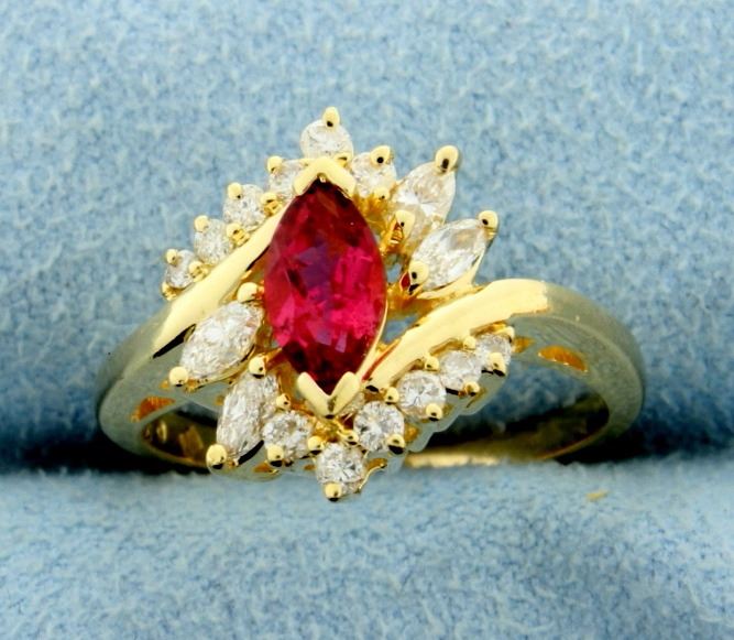 In 14k Yellow Gold. The center natural marquise rubellite garnet is 4mm x 8mm, approx. weight of 0.75ct with an intense pinkish red color and excellent clarity. There are 16 high quality diamonds (4 marquise, 12 round), H color/I clarity. Total diamond weight is 1/2 carat. Size 6.5 4.5g
