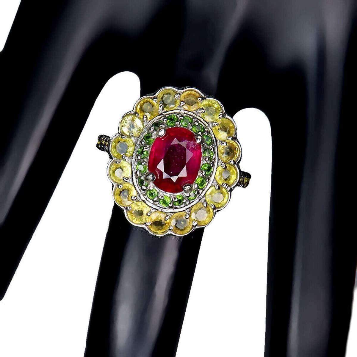 925 STERLING SILVER;PLATE-14K WHITE GOLD;RING SIZE-8.5(RESIZABLE);MAIN STONE-RUBY;OTHER GEMS-CHROME DIOPSIDE, SAPPHIRE;TOTAL WEIGHT-6.95 GRAM (TOTAL WEIGHT OF SILVER + STONE);DIMENSION-* STONE 1.5 TO 9.0 X 7.0 MM.* RING SIZE 8.5* FACE RING 22.0 X 21.0 MM.;MAIN STONE SHAPE-OVAL CUT;MAIN STONE COLOR-BLOOD RED;TREATMENT- YES;ORIGIN-MADAGASCAR;HARDNESS-9;