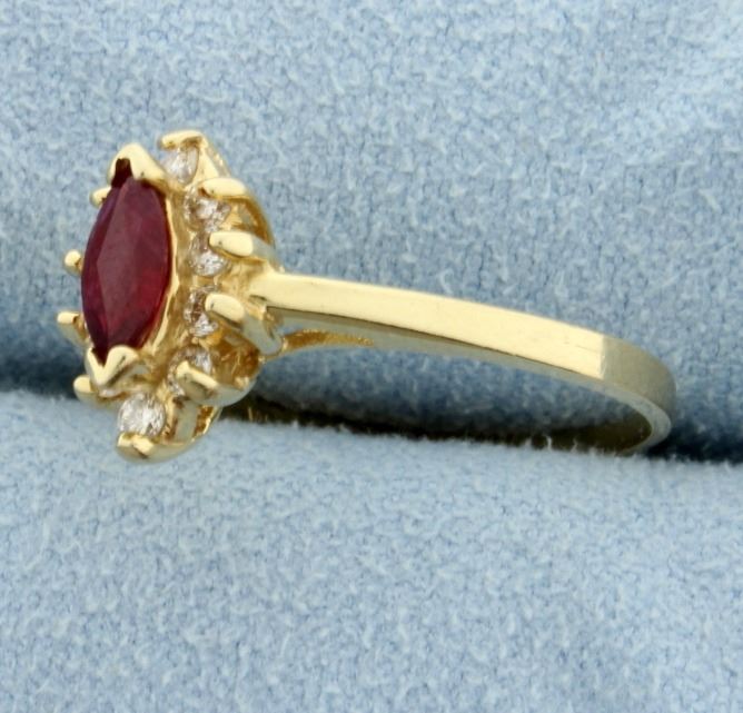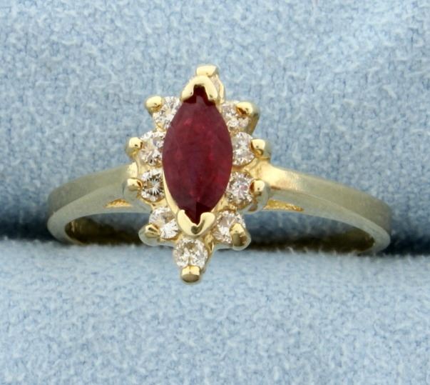 In 14K yellow gold, this ring has a 8x4mm marquise natural ruby that's approx. .75ct, with deep color, and great clarity! There are also ten .01ct diamonds-SI clarity/H color. Size 8 2.8g